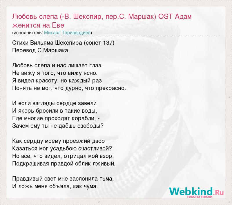 Стихи Вильяма Шекспира (сонет 137) Перевод С.Маршака Любовь слепа и нас лишает глаз. Не вижу я того, что вижу ясно. Я видел красоту, но каждый раз Понять не мог, что дурно, что прекрасно. И если взгляды сердце завели И якорь бросили в такие воды, Где многие проходят корабли, - Зачем ему ты не даёшь свободы? Как сердцу моему проезжий двор Казаться мог усадьбою счастливой? Но всё, что видел, отрицал мой взор, Подкрашивая правдой облик лживый. Правдивый свет мне заслонила тьма, И ложь меня объяла, как чума.
