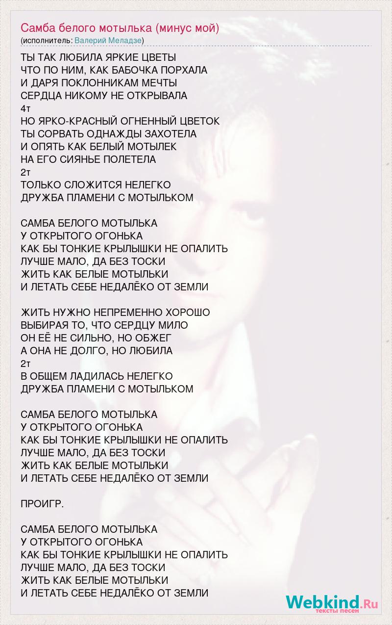 ТЫ ТАК ЛЮБИЛА ЯРКИЕ ЦВЕТЫ ЧТО ПО НИМ, КАК БАБОЧКА ПОРХАЛА И ДАРЯ ПОКЛОННИКАМ МЕЧТЫ СЕРДЦА НИКОМУ НЕ ОТКРЫВАЛА 4т НО ЯРКО-КРАСНЫЙ ОГНЕННЫЙ ЦВЕТОК ТЫ СОРВАТЬ ОДНАЖДЫ ЗАХОТЕЛА И ОПЯТЬ КАК БЕЛЫЙ МОТЫЛЕК НА ЕГО СИЯНЬЕ ПОЛЕТЕЛА 2т ТОЛЬКО СЛОЖИТСЯ НЕЛЕГКО ДРУЖБА ПЛАМЕНИ С МОТЫЛЬКОМ САМБА БЕЛОГО МОТЫЛЬКА У ОТКРЫТОГО ОГОНЬКА КАК БЫ ТОНКИЕ КРЫЛЫШКИ НЕ ОПАЛИТЬ ЛУЧШЕ МАЛО, ДА БЕЗ ТОСКИ ЖИТЬ КАК БЕЛЫЕ МОТЫЛЬКИ И ЛЕТАТЬ СЕБЕ НЕДАЛЁКО ОТ ЗЕМЛИ ЖИТЬ НУЖНО НЕПРЕМЕННО ХОРОШО ВЫБИРАЯ ТО, ЧТО СЕРДЦУ МИЛО ОН ЕЁ НЕ СИЛЬНО, НО ОБЖЕГ А ОНА НЕ ДОЛГО, НО ЛЮБИЛА 2т В ОБЩЕМ ЛАДИЛАСЬ НЕЛЕГКО ДРУЖБА ПЛАМЕНИ С МОТЫЛЬКОМ САМБА БЕЛОГО МОТЫЛЬКА У ОТКРЫТОГО ОГОНЬКА КАК БЫ ТОНКИЕ КРЫЛЫШКИ НЕ ОПАЛИТЬ ЛУЧШЕ МАЛО, ДА БЕЗ ТОСКИ ЖИТЬ КАК БЕЛЫЕ МОТЫЛЬКИ И ЛЕТАТЬ СЕБЕ НЕДАЛЁКО ОТ ЗЕМЛИ ПРОИГР. САМБА БЕЛОГО МОТЫЛЬКА У ОТКРЫТОГО ОГОНЬКА КАК БЫ ТОНКИЕ КРЫЛЫШКИ НЕ ОПАЛИТЬ ЛУЧШЕ МАЛО, ДА БЕЗ ТОСКИ ЖИТЬ КАК БЕЛЫЕ МОТЫЛЬКИ И ЛЕТАТЬ СЕБЕ НЕДАЛЁКО ОТ ЗЕМЛИ
