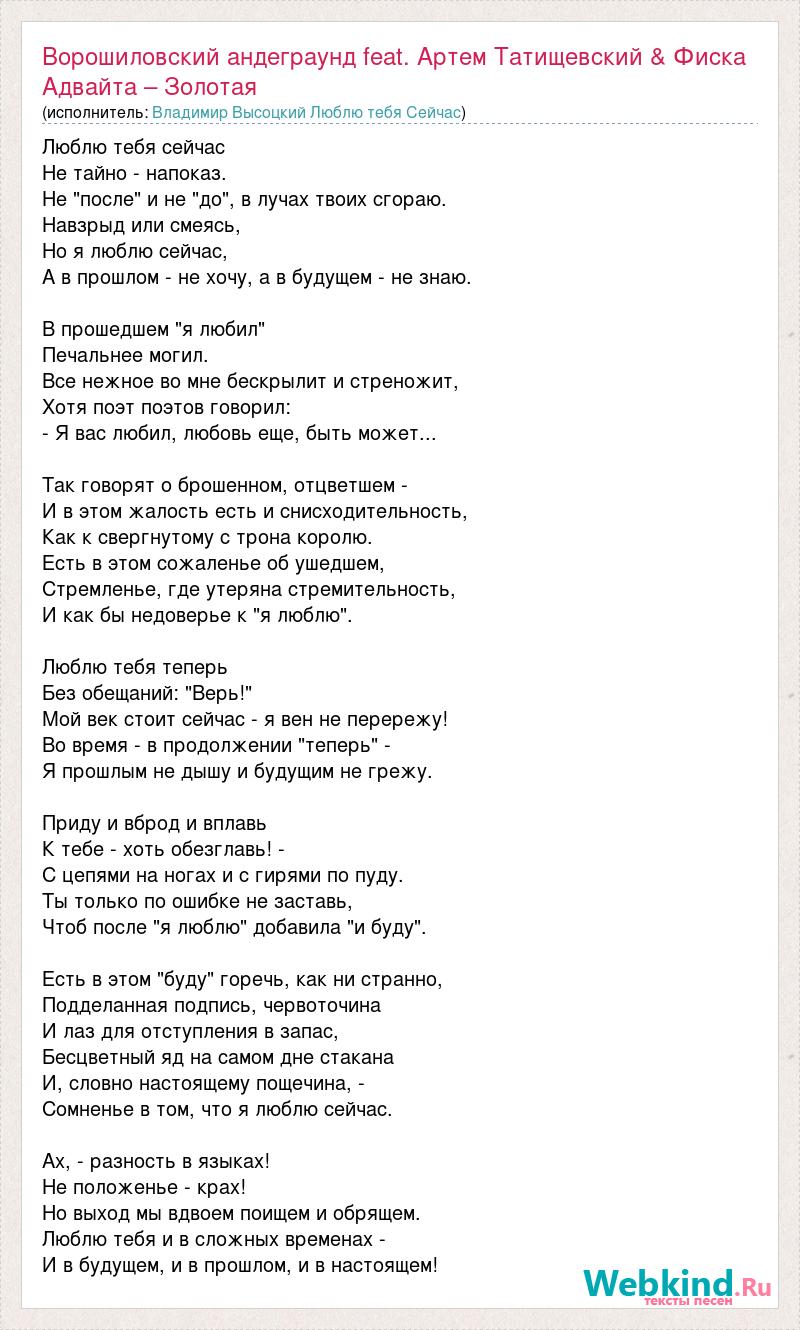 Главная→Исполнители→Владимир Высоцкий Люблю тебя Сейчас→Ворошиловский андеграунд feat. Артем Татищевский & Фиска Адвайта – Золотая