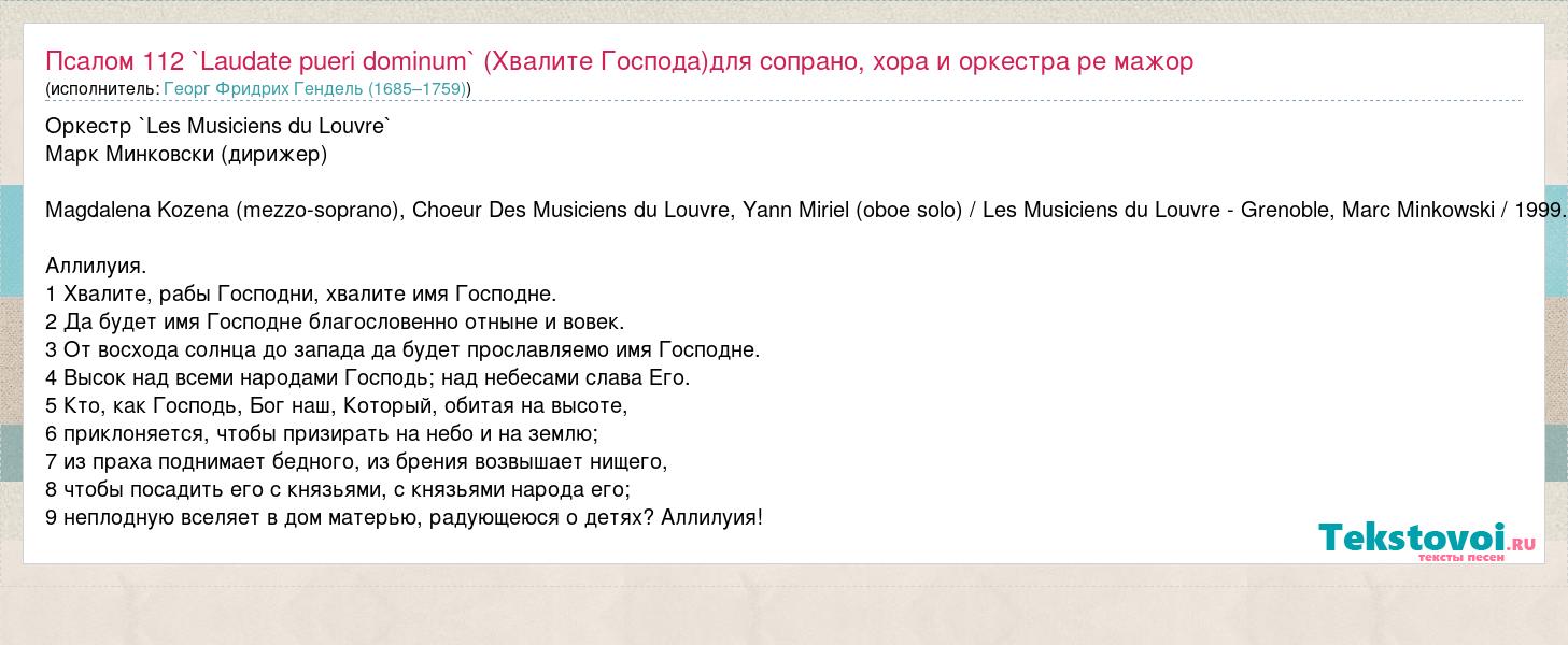 Оркестр `Les Musiciens du Louvre` Марк Минковски (дирижер) Magdalena Kozena (mezzo-soprano), Choeur Des Musiciens du Louvre, Yann Miriel (oboe solo) / Les Musiciens du Louvre - Grenoble, Marc Minkowski / 1999. Аллилуия. 1 Хвалите, рабы Господни, хвалите имя Господне. 2 Да будет имя Господне благословенно отныне и вовек. 3 От восхода солнца до запада да будет прославляемо имя Господне. 4 Высок над всеми народами Господь; над небесами слава Его. 5 Кто, как Господь, Бог наш, Который, обитая на высоте, 6 приклоняется, чтобы призирать на небо и на землю; 7 из праха поднимает бедного, из брения возвышает нищего, 8 чтобы посадить его с князьями, с князьями народа его; 9 неплодную вселяет в дом матерью, радующеюся о детях? Аллилуия!
