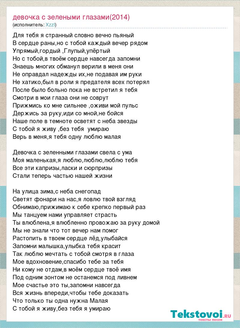 Для тебя я странный словно вечно пьяный В сердце раны,но с тобой каждый вечер рядом Упрямый,гордый ,Глупый,упёртый Но с тобой,в твоём сердце навсегда запомни Знаешь многих обманул верили в меня они Не оправдал надежды их,не подавая им руки Не хатико,был в роли я предателя всех потерял После было больно пока не встретил я тебя Смотри в мои глаза они не соврут Прижмись ко мне сильнее ,оживи мой пульс Держись за руку,иди со мной,не бойся Наше поле в темноте осветят с неба звезды С тобой я живу ,без тебя умираю Верь в меня,я тебя одну люблю малая Девочка с зеленными глазами свела с ума Моя маленькая,я люблю,люблю,люблю тебя Все эти капризы,ласки и сюрпризы Стали теперь частью нашей жизни На улица зима,с неба снегопад Светят фонари на нас,я ловлю твой взгляд Обнимаю,прижимаю к себе крепко первый раз Мы танцуем нами управляет страсть Ты влюблена,я влюбленно провожаю за руку домой Мы не знали что тот вечер нам помог Растопить в твоем сердце лёд,улыбайся Запомни малышка,улыбка тебя красит Так люблю мечтать с тобой смотря в глаза Мое вдохновение,спасибо тебе за тебя Ни кому не отдам,в моём сердце твоё имя Под одним зонтом не останемся под ливнем Мое счастье это ты,запомни навсегда Вся жизнь впереди,чтобы тебе доказать Что только ты одна нужна Малая С тобой я живу,без тебя я умираю