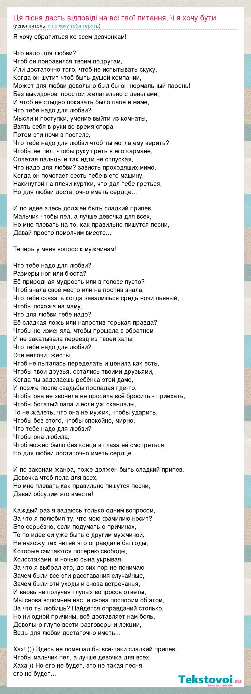 Я хочу обратиться ко всем девчонкам! Что надо для любви? Чтоб он понравился твоим подругам, Или достаточно того, чтоб не испытывать скуку, Когда он шутит чтоб быть душой компании, Может для любви довольно был бы он нормальный парень! Без выкидонов, простой желательно с деньгами, И чтоб не стыдно показать было папе и маме, Что тебе надо для любви? Мысли и поступки, умение выйти из комнаты, Взять себя в руки во время спора Потом эти ночи в постеле, Что тебе надо для любви чтоб ты могла ему верить? Чтобы не пил, чтобы руку греть в его кармане, Сплетая пальцы и так идти не отпуская, Что надо для любви? зависть проходящих мимо, Когда он помогает сесть тебе в его машину, Накинутой на плечи куртки, что дал тебе греться, Но для любви достаточно иметь сердце... И по идее здесь должен быть сладкий припев, Мальчик чтобы пел, а лучше девочка для всех, Но мне плевать на то, как правильно пишутся песни, Давай просто помолчим вместе... Теперь у меня вопрос к мужчинам! Что тебе надо для любви? Размеры ног или бюста? Её природная мудрость или в голове пусто? Чтоб знала своё место или на против знала, Что тебе сказать когда завалишься средь ночи пьяный, Чтобы похожа на маму, Что для любви тебе надо? Её сладкая ложь или напротив горькая правда? Чтобы не изменяла, чтобы прощала в обратном И не закатывала переезд из твоей хаты, Что тебе надо для любви? Эти мелочи, жесты, Чтоб не пыталась переделать и ценила как есть, Чтобы твои друзья, остались твоими друзьями, Когда ты заделаешь ребёнка этой даме, И позже после свадьбы пропадая где-то, Чтобы она не звонила не просила всё бросить - приехать, Чтобы богатый папа и если уж скандалы, То не жалеть, что она не мужик, чтобы ударить, Чтобы без этого, чтобы спокойно, мирно, Что тебе надо для любви? Чтобы она любила, Чтоб можно было без конца в глаза её смотреться, Но для любви достаточно иметь сердце... И по законам жанра, тоже должен быть сладкий припев, Девочка чтоб пела для всех, Но мне плевать как правильно пишутся песни, Давай обсудим это вместе! Каждый раз я задаюcь только одним вопросом, За что я полюбил ту, что мою фамилию носит? Это серьёзно, если подумать о причинах, То по идее ей уже быть с другим мужчиной, Не нахожу тех нитей что оправдали бы годы, Которые считаются потерею свободы, Холостяками, и ночью сына укрывая, За что я выбрал это, до сих пор не понимаю Зачем были все эти расставания случайные, Зачем были эти уходы и снова встречанья, И вновь не получая глупых вопросов ответы, Мы снова вспомним нас, и снова поспорим об этом, За что ты любишь? Найдётся оправданий столько, Но ни одной причины, всё доставляет нам боль, Довольно глупо вести разговоры и лекции, Ведь для любви достаточно иметь... Хах! ))) Здесь не помешал бы всё-таки сладкий припев, Чтобы мальчик пел, а лучше девочка для всех, Хаха )) Но его не будет, это не такая песня его не будет...