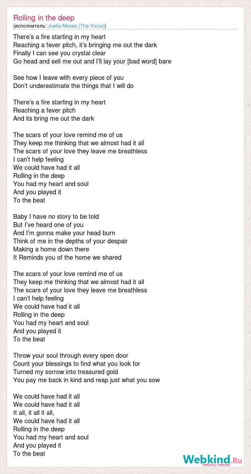 There’s a fire starting in my heart Reaching a fever pitch, it’s bringing me out the dark Finally I can see you crystal clear Go head and sell me out and I’ll lay your [bad word] bare See how I leave with every piece of you Don’t underestimate the things that I will do There’s a fire starting in my heart Reaching a fever pitch And its bring me out the dark The scars of your love remind me of us They keep me thinking that we almost had it all The scars of your love they leave me breathless I can’t help feeling We could have had it all Rolling in the deep You had my heart and soul And you played it To the beat Baby I have no story to be told But I’ve heard one of you And I’m gonna make your head burn Think of me in the depths of your despair Making a home down there It Reminds you of the home we shared The scars of your love remind me of us They keep me thinking that we almost had it all The scars of your love they leave me breathless I can’t help feeling We could have had it all Rolling in the deep You had my heart and soul And you played it To the beat Throw your soul through every open door Count your blessings to find what you look for Turned my sorrow into treasured gold You pay me back in kind and reap just what you sow We could have had it all We could have had it all It all, it all it all, We could have had it all Rolling in the deep You had my heart and soul And you played it To the beat