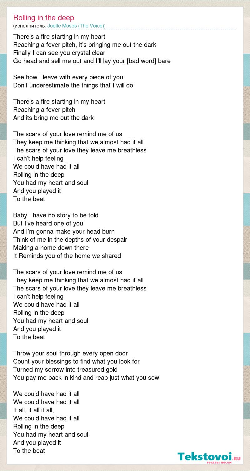 There’s a fire starting in my heart Reaching a fever pitch, it’s bringing me out the dark Finally I can see you crystal clear Go head and sell me out and I’ll lay your [bad word] bare See how I leave with every piece of you Don’t underestimate the things that I will do There’s a fire starting in my heart Reaching a fever pitch And its bring me out the dark The scars of your love remind me of us They keep me thinking that we almost had it all The scars of your love they leave me breathless I can’t help feeling We could have had it all Rolling in the deep You had my heart and soul And you played it To the beat Baby I have no story to be told But I’ve heard one of you And I’m gonna make your head burn Think of me in the depths of your despair Making a home down there It Reminds you of the home we shared The scars of your love remind me of us They keep me thinking that we almost had it all The scars of your love they leave me breathless I can’t help feeling We could have had it all Rolling in the deep You had my heart and soul And you played it To the beat Throw your soul through every open door Count your blessings to find what you look for Turned my sorrow into treasured gold You pay me back in kind and reap just what you sow We could have had it all We could have had it all It all, it all it all, We could have had it all Rolling in the deep You had my heart and soul And you played it To the beat