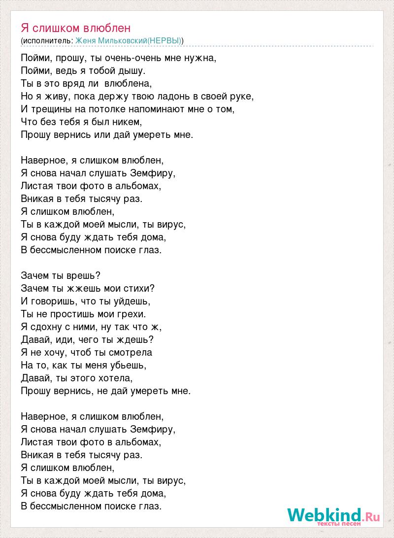 Пойми, прошу, ты очень-очень мне нужна, Пойми, ведь я тобой дышу. Ты в это вряд ли влюблена, Но я живу, пока держу твою ладонь в своей руке, И трещины на потолке напоминают мне о том, Что без тебя я был никем, Прошу вернись или дай умереть мне. Наверное, я слишком влюблен, Я снова начал слушать Земфиру, Листая твои фото в альбомах, Вникая в тебя тысячу раз. Я слишком влюблен, Ты в каждой моей мысли, ты вирус, Я снова буду ждать тебя дома, В бессмысленном поиске глаз. Зачем ты врешь? Зачем ты жжешь мои стихи? И говоришь, что ты уйдешь, Ты не простишь мои грехи. Я сдохну с ними, ну так что ж, Давай, иди, чего ты ждешь? Я не хочу, чтоб ты смотрела На то, как ты меня убьешь, Давай, ты этого хотела, Прошу вернись, не дай умереть мне. Наверное, я слишком влюблен, Я снова начал слушать Земфиру, Листая твои фото в альбомах, Вникая в тебя тысячу раз. Я слишком влюблен, Ты в каждой моей мысли, ты вирус, Я снова буду ждать тебя дома, В бессмысленном поиске глаз.