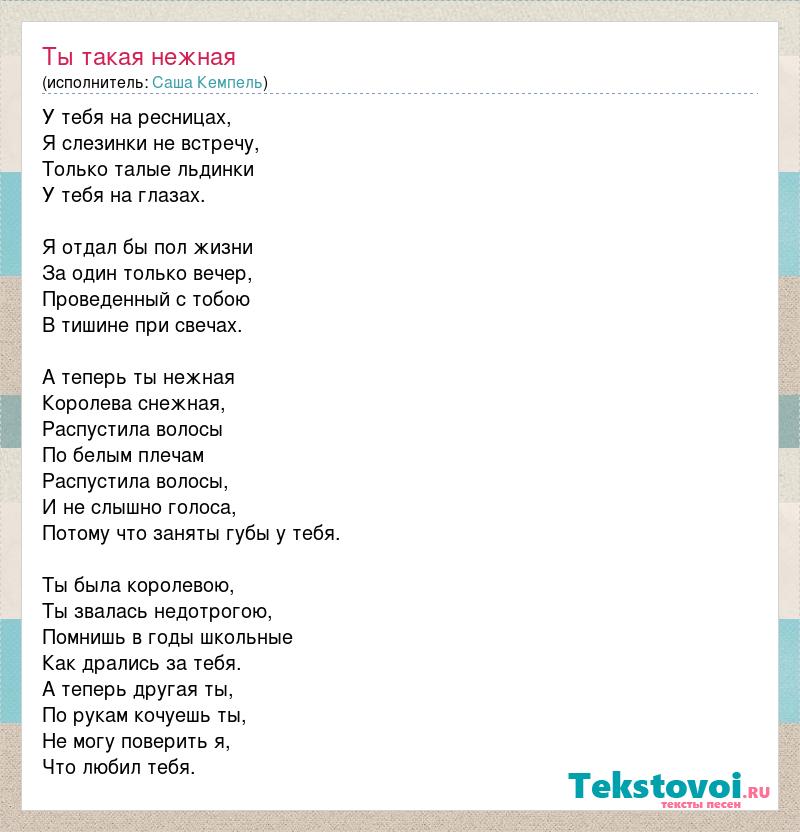 У тебя на ресницах, Я слезинки не встречу, Только талые льдинки У тебя на глазах. Я отдал бы пол жизни За один только вечер, Проведенный с тобою В тишине при свечах. А теперь ты нежная Королева снежная, Распустила волосы По белым плечам Распустила волосы, И не слышно голоса, Потому что заняты губы у тебя. Ты была королевою, Ты звалась недотрогою, Помнишь в годы школьные Как дрались за тебя. А теперь другая ты, По рукам кочуешь ты, Не могу поверить я, Что любил тебя.