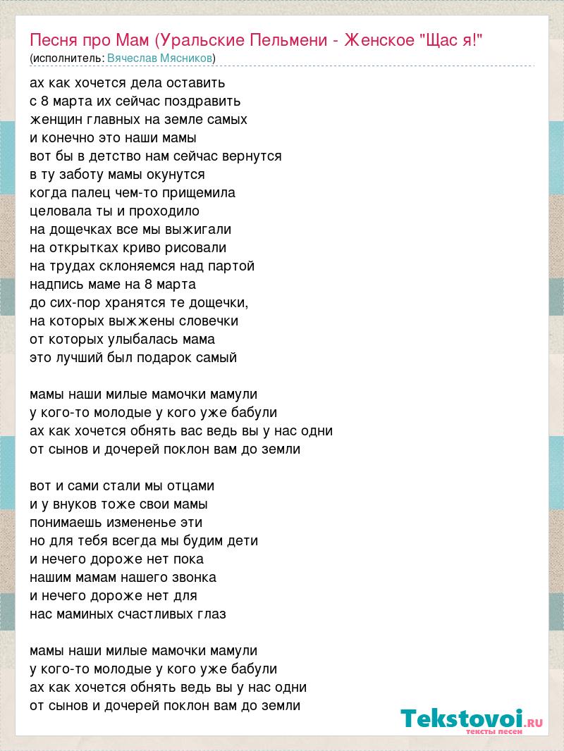 ах как хочется дела оставить с 8 марта их сейчас поздравить женщин главных на земле самых и конечно это наши мамы вот бы в детство нам сейчас вернутся в ту заботу мамы окунутся когда палец чем-то прищемила целовала ты и проходило на дощечках все мы выжигали на открытках криво рисовали на трудах склоняемся над партой надпись маме на 8 марта до сих-пор хранятся те дощечки, на которых выжжены словечки от которых улыбалась мама это лучший был подарок самый мамы наши милые мамочки мамули у кого-то молодые у кого уже бабули ах как хочется обнять вас ведь вы у нас одни от сынов и дочерей поклон вам до земли вот и сами стали мы отцами и у внуков тоже свои мамы понимаешь измененье эти но для тебя всегда мы будим дети и нечего дороже нет пока нашим мамам нашего звонка и нечего дороже нет для нас маминых счастливых глаз мамы наши милые мамочки мамули у кого-то молодые у кого уже бабули ах как хочется обнять ведь вы у нас одни от сынов и дочерей поклон вам до земли