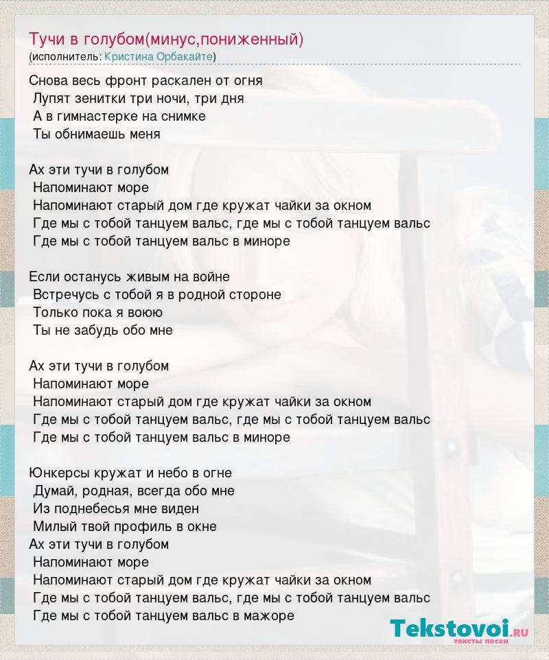 Снова весь фронт раскален от огня Лупят зенитки три ночи, три дня А в гимнастерке на снимке Ты обнимаешь меня Ах эти тучи в голубом Напоминают море Напоминают старый дом где кружат чайки за окном Где мы с тобой танцуем вальс, где мы с тобой танцуем вальс Где мы с тобой танцуем вальс в миноре Если останусь живым на войне Встречусь с тобой я в родной стороне Только пока я воюю Ты не забудь обо мне Ах эти тучи в голубом Напоминают море Напоминают старый дом где кружат чайки за окном Где мы с тобой танцуем вальс, где мы с тобой танцуем вальс Где мы с тобой танцуем вальс в миноре Юнкерсы кружат и небо в огне Думай, родная, всегда обо мне Из поднебесья мне виден Милый твой профиль в окне Ах эти тучи в голубом Напоминают море Напоминают старый дом где кружат чайки за окном Где мы с тобой танцуем вальс, где мы с тобой танцуем вальс Где мы с тобой танцуем вальс в мажоре