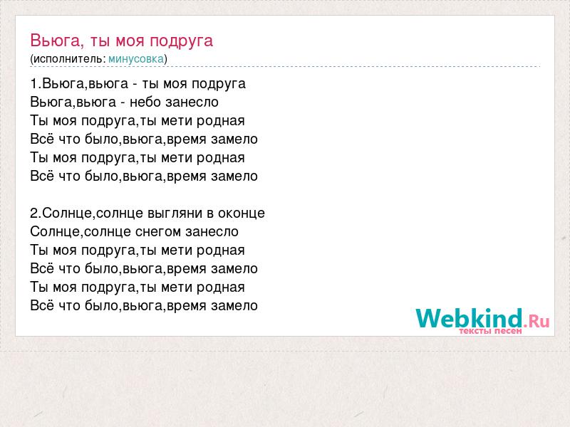 1.Вьюга,вьюга - ты моя подруга Вьюга,вьюга - небо занесло Ты моя подруга,ты мети родная Всё что было,вьюга,время замело Ты моя подруга,ты мети родная Всё что было,вьюга,время замело 2.Солнце,солнце выгляни в оконце Солнце,солнце снегом занесло Ты моя подруга,ты мети родная Всё что было,вьюга,время замело Ты моя подруга,ты мети родная Всё что было,вьюга,время замело