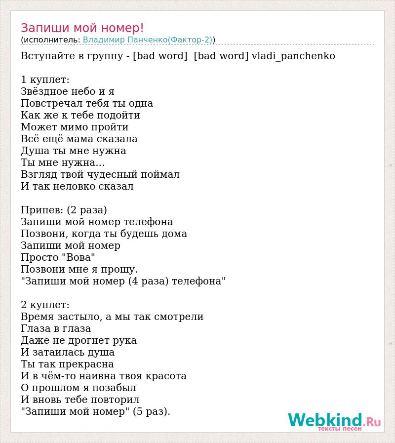 Вступайте в группу - [bad word] [bad word] vladi_panchenko 1 куплет: Звёздное небо и я Повстречал тебя ты одна Как же к тебе подойти Может мимо пройти Всё ещё мама сказала Душа ты мне нужна Ты мне нужна... Взгляд твой чудесный поймал И так неловко сказал Припев: (2 раза) Запиши мой номер телефона Позвони, когда ты будешь дома Запиши мой номер Просто "Вова" Позвони мне я прошу. "Запиши мой номер (4 раза) телефона" 2 куплет: Время застыло, а мы так смотрели Глаза в глаза Даже не дрогнет рука И затаилась душа Ты так прекрасна И в чём-то наивна твоя красота О прошлом я позабыл И вновь тебе повторил "Запиши мой номер" (5 раз).