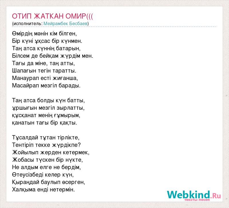 Өмірдің мәнін кім білген, Бір күні ұқсас бір күнмен. Таң атса күннің батарын, Білсем де бейқам жүрдім мен. Тағы да міне, таң атты, Шапағын тегін таратты. Манаурап есті жиғанша, Масайрап мезгіл барады. Таң атса болды күн батты, ұршығын мезгіл зырлатты, құсқанат менің ғұмырым, қанатын тағы бір қақты. Тұсалдай тұтан тірлікте, Тентіріп текке жүрдікпе? Жойылып жерден кетермек, Жобасы түскен бір нүкте, Не алдым елге не бердім, Өтеусізбеді келер күн, Қыраңдай баулып өсерген, Халқыма енді нетермін.