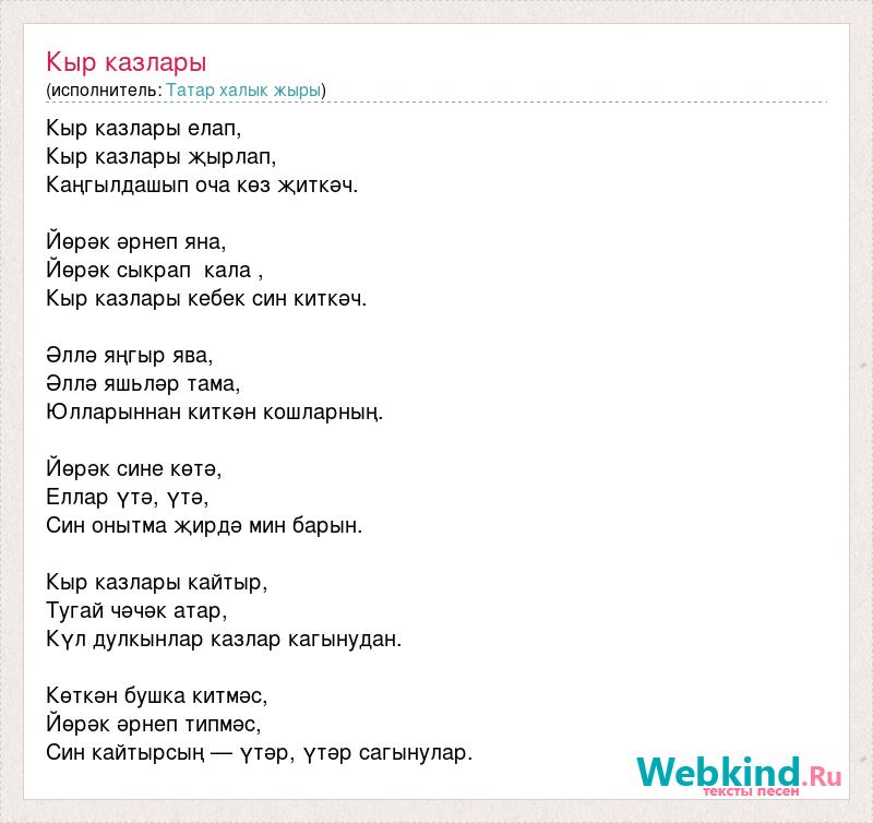 Кыр казлары елап, Кыр казлары җырлап, Каңгылдашып оча көз җиткәч. Йөрәк әрнеп яна, Йөрәк сыкрап кала , Кыр казлары кебек син киткәч. Әллә яңгыр ява, Әллә яшьләр тама, Юлларыннан киткән кошларның. Йөрәк сине көтә, Еллар үтә, үтә, Син онытма җирдә мин барын. Кыр казлары кайтыр, Тугай чәчәк атар, Күл дулкынлар казлар кагынудан. Көткән бушка китмәс, Йөрәк әрнеп типмәс, Син кайтырсың — үтәр, үтәр сагынулар.