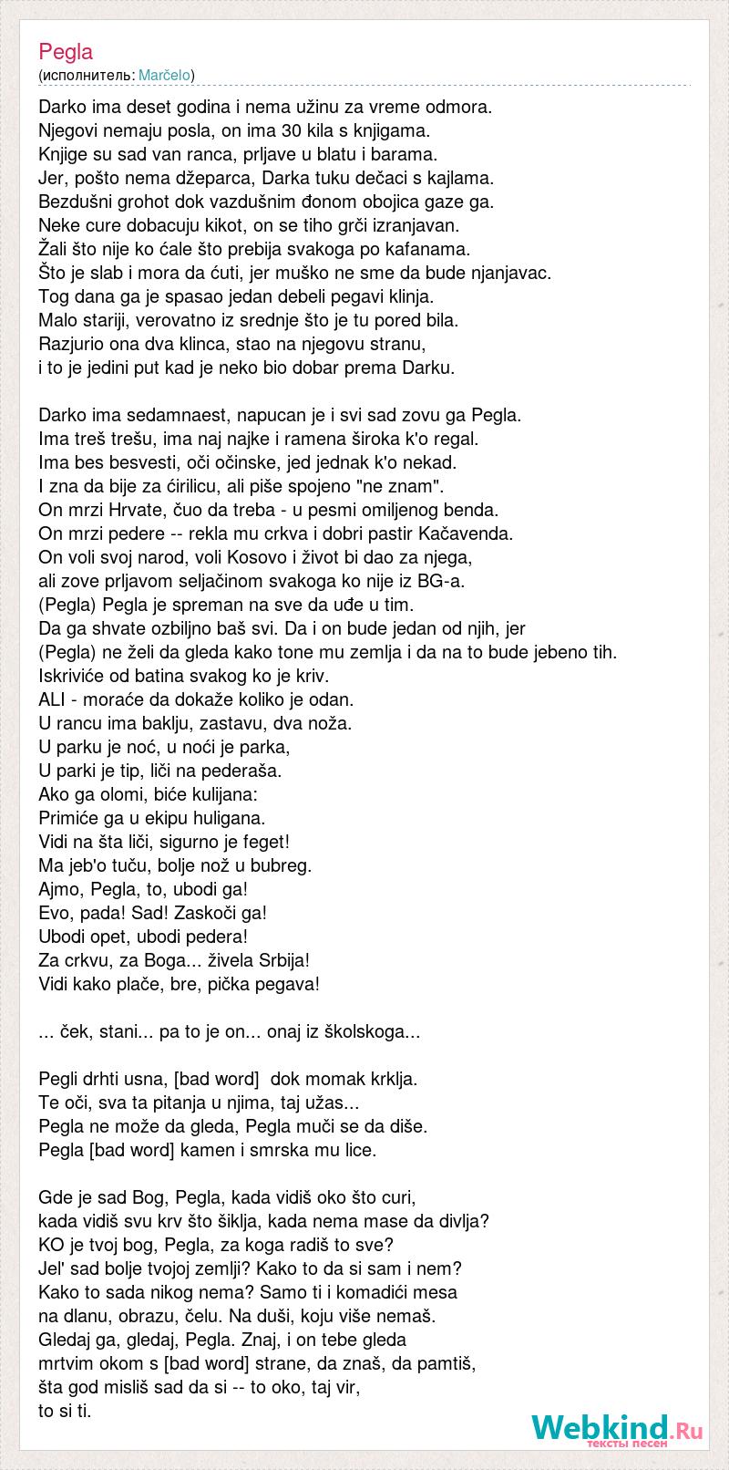 Darko ima deset godina i nema užinu za vreme odmora. Njegovi nemaju posla, on ima 30 kila s knjigama. Knjige su sad van ranca, prljave u blatu i barama. Jer, pošto nema džeparca, Darka tuku dečaci s kajlama. Bezdušni grohot dok vazdušnim đonom obojica gaze ga. Neke cure dobacuju kikot, on se tiho grči izranjavan. Žali što nije ko ćale što prebija svakoga po kafanama. Što je slab i mora da ćuti, jer muško ne sme da bude njanjavac. Tog dana ga je spasao jedan debeli pegavi klinja. Malo stariji, verovatno iz srednje što je tu pored bila. Razjurio ona dva klinca, stao na njegovu stranu, i to je jedini put kad je neko bio dobar prema Darku. Darko ima sedamnaest, napucan je i svi sad zovu ga Pegla. Ima treš trešu, ima naj najke i ramena široka k'o regal. Ima bes besvesti, oči očinske, jed jednak k'o nekad. I zna da bije za ćirilicu, ali piše spojeno "ne znam". On mrzi Hrvate, čuo da treba - u pesmi omiljenog benda. On mrzi pedere -- rekla mu crkva i dobri pastir Kačavenda. On voli svoj narod, voli Kosovo i život bi dao za njega, ali zove prljavom seljačinom svakoga ko nije iz BG-a. (Pegla) Pegla je spreman na sve da uđe u tim. Da ga shvate ozbiljno baš svi. Da i on bude jedan od njih, jer (Pegla) ne želi da gleda kako tone mu zemlja i da na to bude jebeno tih. Iskriviće od batina svakog ko je kriv. ALI - moraće da dokaže koliko je odan. U rancu ima baklju, zastavu, dva noža. U parku je noć, u noći je parka, U parki je tip, liči na pederaša. Ako ga olomi, biće kulijana: Primiće ga u ekipu huligana. Vidi na šta liči, sigurno je feget! Ma jeb'o tuču, bolje nož u bubreg. Ajmo, Pegla, to, ubodi ga! Evo, pada! Sad! Zaskoči ga! Ubodi opet, ubodi pedera! Za crkvu, za Boga... živela Srbija! Vidi kako plače, bre, pička pegava! ... ček, stani... pa to je on... onaj iz školskoga... Pegli drhti usna, [bad word] dok momak krklja. Te oči, sva ta pitanja u njima, taj užas... Pegla ne može da gleda, Pegla muči se da diše. Pegla [bad word] kamen i smrska mu lice. Gde je sad Bog, Pegla, kada vidiš oko što curi, kada vidiš svu krv što šiklja, kada nema mase da divlja? KO je tvoj bog, Pegla, za koga radiš to sve? Jel' sad bolje tvojoj zemlji? Kako to da si sam i nem? Kako to sada nikog nema? Samo ti i komadići mesa na dlanu, obrazu, čelu. Na duši, koju više nemaš. Gledaj ga, gledaj, Pegla. Znaj, i on tebe gleda mrtvim okom s [bad word] strane, da znaš, da pamtiš, šta god misliš sad da si -- to oko, taj vir, to si ti.