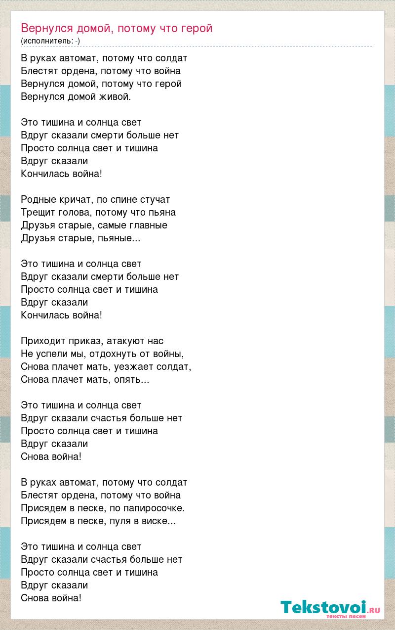 В руках автомат, потому что солдат Блестят ордена, потому что война Вернулся домой, потому что герой Вернулся домой живой. Это тишина и солнца свет Вдруг сказали смерти больше нет Просто солнца свет и тишина Вдруг сказали Кончилась война! Родные кричат, по спине стучат Трещит голова, потому что пьяна Друзья старые, самые главные Друзья старые, пьяные... Это тишина и солнца свет Вдруг сказали смерти больше нет Просто солнца свет и тишина Вдруг сказали Кончилась война! Приходит приказ, атакуют нас Не успели мы, отдохнуть от войны, Снова плачет мать, уезжает солдат, Снова плачет мать, опять... Это тишина и солнца свет Вдруг сказали счастья больше нет Просто солнца свет и тишина Вдруг сказали Снова война! В руках автомат, потому что солдат Блестят ордена, потому что война Присядем в песке, по папиросочке. Присядем в песке, пуля в виске... Это тишина и солнца свет Вдруг сказали счастья больше нет Просто солнца свет и тишина Вдруг сказали Снова война!