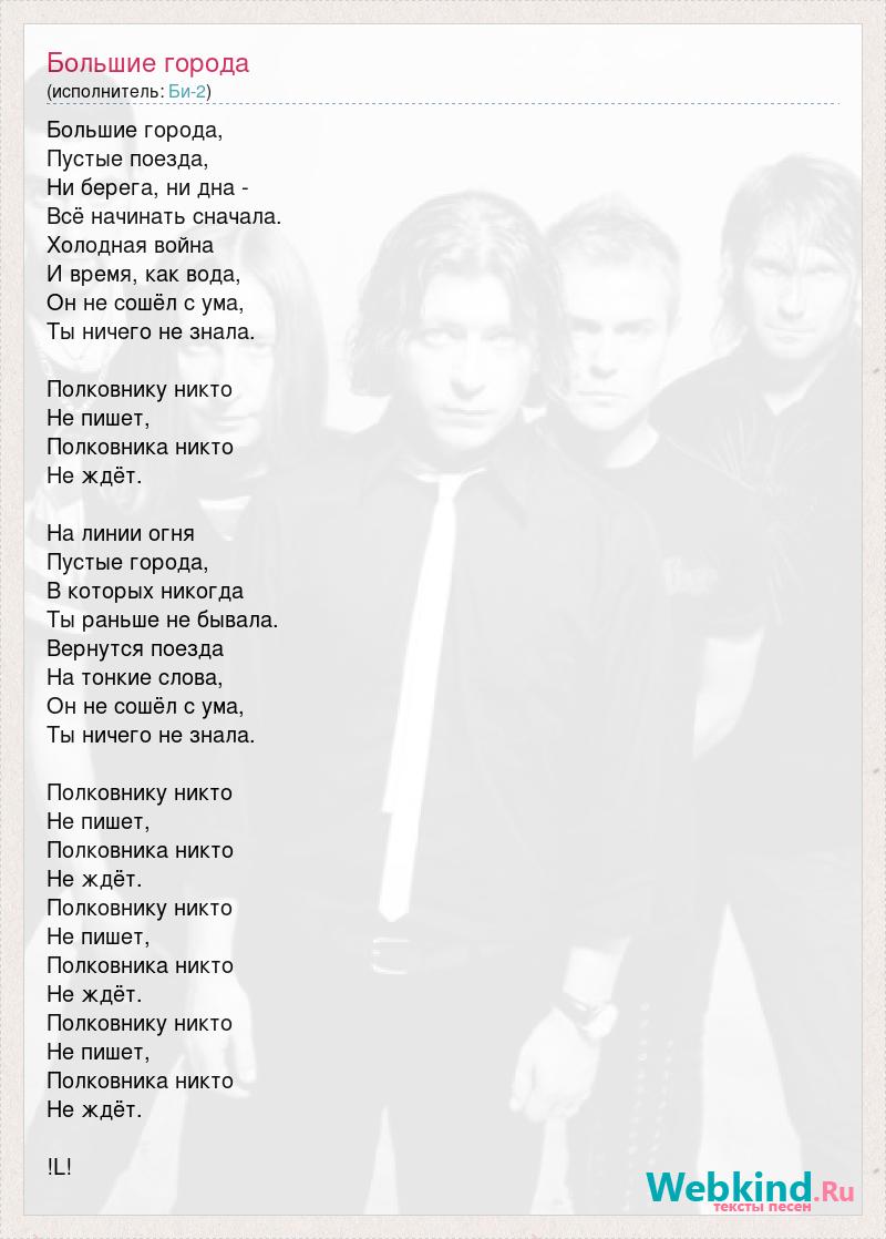 Большие города, Пустые поезда, Ни берега, ни дна - Всё начинать сначала. Холодная война И время, как вода, Он не сошёл с ума, Ты ничего не знала. Полковнику никто Не пишет, Полковника никто Не ждёт. На линии огня Пустые города, В которых никогда Ты раньше не бывала. Вернутся поезда На тонкие слова, Он не сошёл с ума, Ты ничего не знала. Полковнику никто Не пишет, Полковника никто Не ждёт. Полковнику никто Не пишет, Полковника никто Не ждёт. Полковнику никто Не пишет, Полковника никто Не ждёт. !L!