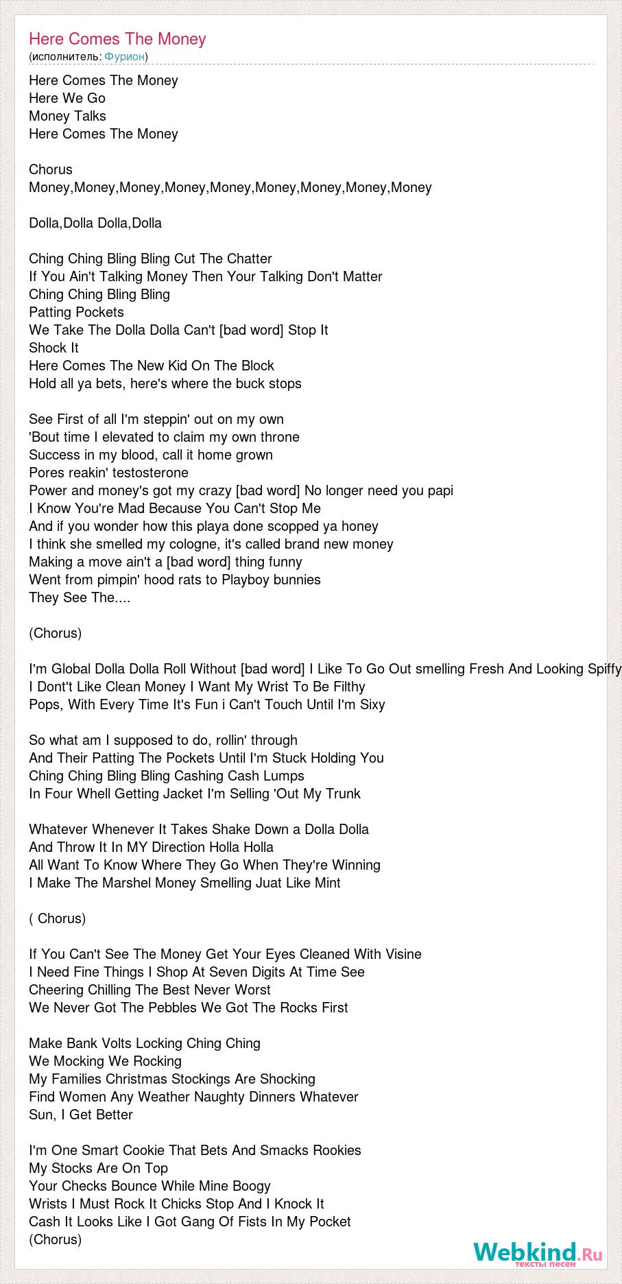Here Comes The Money Here We Go Money Talks Here Comes The Money Chorus Money,Money,Money,Money,Money,Money,Money,Money,Money Dolla,Dolla Dolla,Dolla Ching Ching Bling Bling Cut The Chatter If You Ain't Talking Money Then Your Talking Don't Matter Ching Ching Bling Bling Patting Pockets We Take The Dolla Dolla Can't [bad word] Stop It Shock It Here Comes The New Kid On The Block Hold all ya bets, here's where the buck stops See First of all I'm steppin' out on my own 'Bout time I elevated to claim my own throne Success in my blood, call it home grown Pores reakin' testosterone Power and money's got my crazy [bad word] No longer need you papi I Know You're Mad Because You Can't Stop Me And if you wonder how this playa done scopped ya honey I think she smelled my cologne, it's called brand new money Making a move ain't a [bad word] thing funny Went from pimpin' hood rats to Playboy bunnies They See The.... (Chorus) I'm Global Dolla Dolla Roll Without [bad word] I Like To Go Out smelling Fresh And Looking Spiffy I Dont't Like Clean Money I Want My Wrist To Be Filthy Pops, With Every Time It's Fun i Can't Touch Until I'm Sixy So what am I supposed to do, rollin' through And Their Patting The Pockets Until I'm Stuck Holding You Ching Ching Bling Bling Cashing Cash Lumps In Four Whell Getting Jacket I'm Selling 'Out My Trunk Whatever Whenever It Takes Shake Down a Dolla Dolla And Throw It In MY Direction Holla Holla All Want To Know Where They Go When They're Winning I Make The Marshel Money Smelling Juat Like Mint ( Chorus) If You Can't See The Money Get Your Eyes Cleaned With Visine I Need Fine Things I Shop At Seven Digits At Time See Cheering Chilling The Best Never Worst We Never Got The Pebbles We Got The Rocks First Make Bank Volts Locking Ching Ching We Mocking We Rocking My Families Christmas Stockings Are Shocking Find Women Any Weather Naughty Dinners Whatever Sun, I Get Better I'm One Smart Cookie That Bets And Smacks Rookies My Stocks Are On Top Your Checks Bounce While Mine Boogy Wrists I Must Rock It Chicks Stop And I Knock It Cash It Looks Like I Got Gang Of Fists In My Pocket (Chorus)