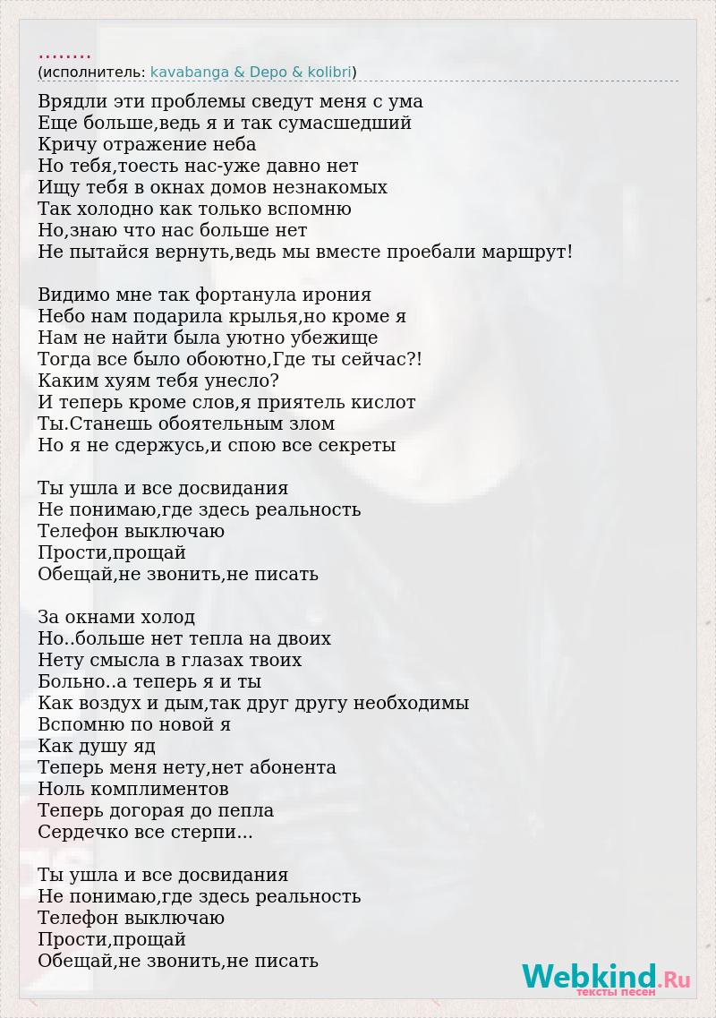 Врядли эти проблемы сведут меня с ума Еще больше,ведь я и так сумасшедший Кричу отражение неба Но тебя,тоесть нас-уже давно нет Ищу тебя в окнах домов незнакомых Так холодно как только вспомню Но,знаю что нас больше нет Не пытайся вернуть,ведь мы вместе проебали маршрут! Видимо мне так фортанула ирония Небо нам подарила крылья,но кроме я Нам не найти была уютно убежище Тогда все было обоютно,Где ты сейчас?! Каким хуям тебя унесло? И теперь кроме слов,я приятель кислот Ты.Станешь обоятельным злом Но я не сдержусь,и спою все секреты Ты ушла и все досвидания Не понимаю,где здесь реальность Телефон выключаю Прости,прощай Обещай,не звонить,не писать За окнами холод Но..больше нет тепла на двоих Нету смысла в глазах твоих Больно..а теперь я и ты Как воздух и дым,так друг другу необходимы Вспомню по новой я Как душу яд Теперь меня нету,нет абонента Ноль комплиментов Теперь догорая до пепла Сердечко все стерпи... Ты ушла и все досвидания Не понимаю,где здесь реальность Телефон выключаю Прости,прощай Обещай,не звонить,не писать