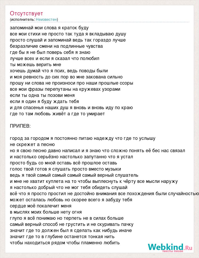 запоминай мои слова я краток буду все мои стихи не просто так туда я вкладываю душу просто слушай и запоминай ведь так гораздо лучше безразличие смени на подлинные чувства где бы я не был поверь себя я знаю лучше всех и если я сказал что полюбил ты можешь верить мне хочешь думай что я псих, ведь поводы были и моя ревность до сих пор во мне закована сильно прошу ни слова не произноси про наши прошлые ссоры все мои фразы перепутаны на кружевах узорами если ты одна ты позови меня если я один я буду ждать тебя и для спасенья наших душ я вновь и вновь иду по краю где то там любовь живёт а где то умирает ПРИПЕВ: город за городом я постоянно питаю надежду что где то услышу не скрежет а песню но я свою песню давно написал и я знаю что сложно понять её бес нас связал и настолько серьёзно настолько запутанно что я устал просто будь со мной оставь всё прошлое оставь голос твой готов я слушать просто вместо музыки ведь я твой самый самый самый самый верный слушатель и мне не хватит куплета на то чтобы выплеснуть к чёрту все мысли наружу я настолько добрый что не мог тебя обидеть слушай всё что я просто простил не достойно внимания все похождения были случайностью может осталась любовь но скорее всего я забуду тебя сердце моё покалечит меня в мыслях моих больше нету огня глупо я всё понимаю но терпеть не в силах больше самый верный способ не грустить и не скуривать пачку значит где то должен был я сделать как нибудь иначе значит где то в глубине останется тонкая нить чтобы находиться рядом чтобы пламенно любить