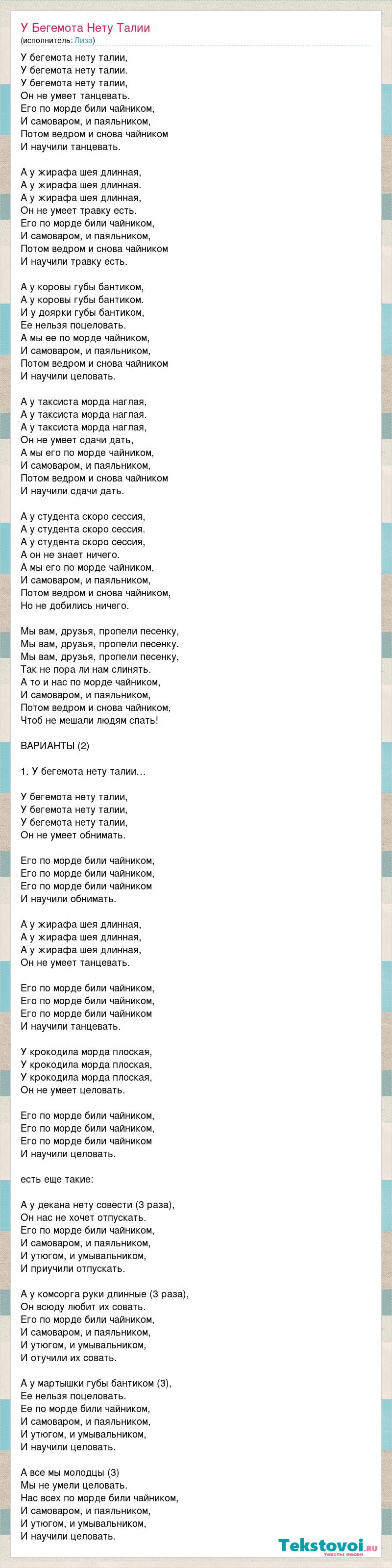 У бегемота нету талии, У бегемота нету талии. У бегемота нету талии, Он не умеет танцевать. Его по морде били чайником, И самоваром, и паяльником, Потом ведром и снова чайником И научили танцевать. А у жирафа шея длинная, А у жирафа шея длинная. А у жирафа шея длинная, Он не умеет травку есть. Его по морде били чайником, И самоваром, и паяльником, Потом ведром и снова чайником И научили травку есть. А у коровы губы бантиком, А у коровы губы бантиком. И у доярки губы бантиком, Ее нельзя поцеловать. А мы ее по морде чайником, И самоваром, и паяльником, Потом ведром и снова чайником И научили целовать. А у таксиста морда наглая, А у таксиста морда наглая. А у таксиста морда наглая, Он не умеет сдачи дать, А мы его по морде чайником, И самоваром, и паяльником, Потом ведром и снова чайником И научили сдачи дать. А у студента скоро сессия, А у студента скоро сессия. А у студента скоро сессия, А он не знает ничего. А мы его по морде чайником, И самоваром, и паяльником, Потом ведром и снова чайником, Но не добились ничего. Мы вам, друзья, пропели песенку, Мы вам, друзья, пропели песенку. Мы вам, друзья, пропели песенку, Так не пора ли нам слинять. А то и нас по морде чайником, И самоваром, и паяльником, Потом ведром и снова чайником, Чтоб не мешали людям спать! ВАРИАНТЫ (2) 1. У бегемота нету талии… У бегемота нету талии, У бегемота нету талии, У бегемота нету талии, Он не умеет обнимать. Его по морде били чайником, Его по морде били чайником, Его по морде били чайником И научили обнимать. А у жирафа шея длинная, А у жирафа шея длинная, А у жирафа шея длинная, Он не умеет танцевать. Его по морде били чайником, Его по морде били чайником, Его по морде били чайником И научили танцевать. У крокодила морда плоская, У крокодила морда плоская, У крокодила морда плоская, Он не умеет целовать. Его по морде били чайником, Его по морде били чайником, Его по морде били чайником И научили целовать. есть еще такие: А у декана нету совести (3 раза), Он нас не хочет отпускать. Его по морде били чайником, И самоваром, и паяльником, И утюгом, и умывальником, И приучили отпускать. А у комсорга руки длинные (3 раза), Он всюду любит их совать. Его по морде били чайником, И самоваром, и паяльником, И утюгом, и умывальником, И отучили их совать. А у мартышки губы бантиком (3), Ее нельзя поцеловать. Ее по морде били чайником, И самоваром, и паяльником, И утюгом, и умывальником, И научили целовать. А все мы молодцы (3) Мы не умели целовать. Нас всех по морде били чайником, И самоваром, и паяльником, И утюгом, и умывальником, И научили целовать.