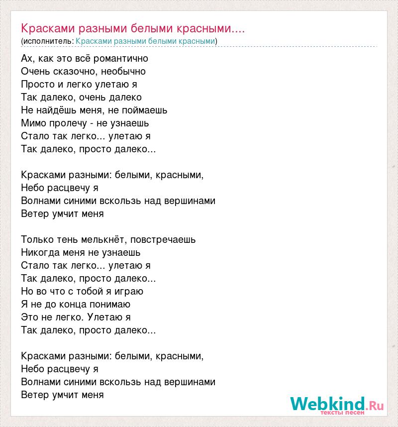 Ах, как это всё романтично Очень сказочно, необычно Просто и легко улетаю я Так далеко, очень далеко Не найдёшь меня, не поймаешь Мимо пролечу - не узнаешь Стало так легко... улетаю я Так далеко, просто далеко... Красками разными: белыми, красными, Небо расцвечу я Волнами синими вскользь над вершинами Ветер умчит меня Только тень мелькнёт, повстречаешь Никогда меня не узнаешь Стало так легко... улетаю я Так далеко, просто далеко... Но во что с тобой я играю Я не до конца понимаю Это не легко. Улетаю я Так далеко, просто далеко... Красками разными: белыми, красными, Небо расцвечу я Волнами синими вскользь над вершинами Ветер умчит меня