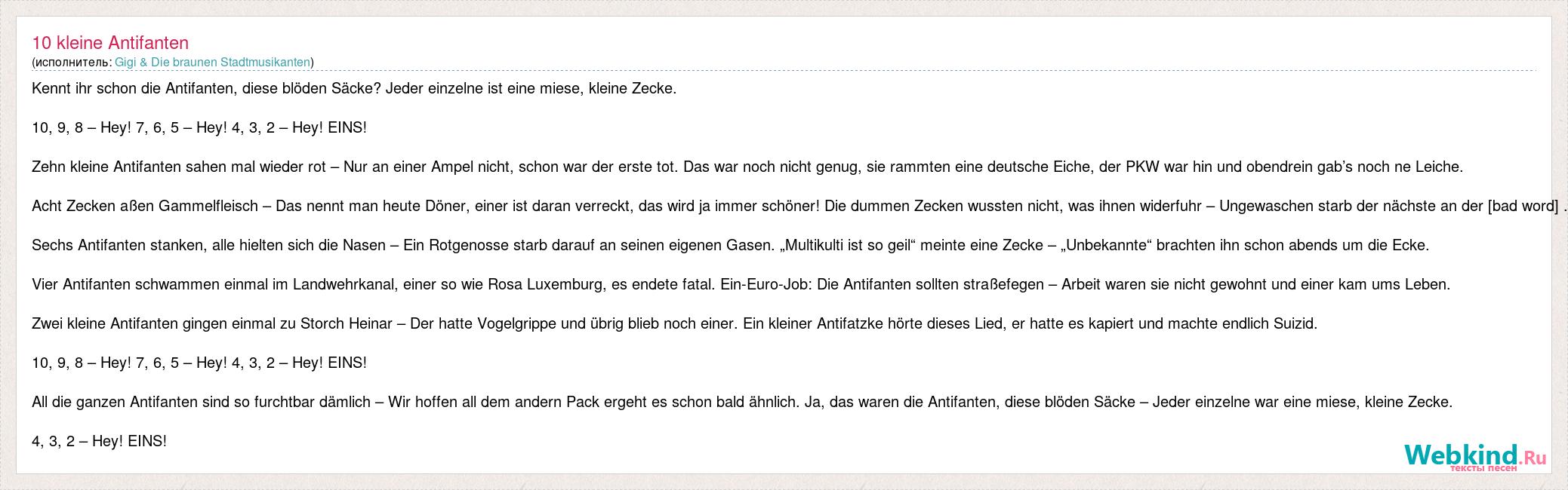 Kennt ihr schon die Antifanten, diese blöden Säcke? Jeder einzelne ist eine miese, kleine Zecke. 10, 9, 8 – Hey! 7, 6, 5 – Hey! 4, 3, 2 – Hey! EINS! Zehn kleine Antifanten sahen mal wieder rot – Nur an einer Ampel nicht, schon war der erste tot. Das war noch nicht genug, sie rammten eine deutsche Eiche, der PKW war hin und obendrein gab’s noch ne Leiche. Acht Zecken aßen Gammelfleisch – Das nennt man heute Döner, einer ist daran verreckt, das wird ja immer schöner! Die dummen Zecken wussten nicht, was ihnen widerfuhr – Ungewaschen starb der nächste an der [bad word] . Sechs Antifanten stanken, alle hielten sich die Nasen – Ein Rotgenosse starb darauf an seinen eigenen Gasen. „Multikulti ist so geil“ meinte eine Zecke – „Unbekannte“ brachten ihn schon abends um die Ecke. Vier Antifanten schwammen einmal im Landwehrkanal, einer so wie Rosa Luxemburg, es endete fatal. Ein-Euro-Job: Die Antifanten sollten straßefegen – Arbeit waren sie nicht gewohnt und einer kam ums Leben. Zwei kleine Antifanten gingen einmal zu Storch Heinar – Der hatte Vogelgrippe und übrig blieb noch einer. Ein kleiner Antifatzke hörte dieses Lied, er hatte es kapiert und machte endlich Suizid. 10, 9, 8 – Hey! 7, 6, 5 – Hey! 4, 3, 2 – Hey! EINS! All die ganzen Antifanten sind so furchtbar dämlich – Wir hoffen all dem andern Pack ergeht es schon bald ähnlich. Ja, das waren die Antifanten, diese blöden Säcke – Jeder einzelne war eine miese, kleine Zecke. 4, 3, 2 – Hey! EINS!