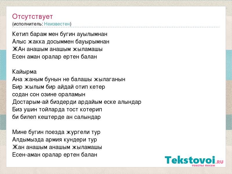 Кетип барам мен бугин ауылымнан Алыс жакка досыммен бауырымнан ЖАн анашым анашым жыламашы Есен аман оралар ертен балан Кайырма Ана жаным бунын не балашы жылаганын Бир жылым бир айдай отип кетер содан сон озине ораламын Достарым-ай биздерди ардайым еске алындар Биз ушин тойларда тост котерип би билеп кештерде ан салындар Мине бугин поезда жургели тур Алдымызда армия кундери тур Жан анашым анашым жыламашы Есен-аман оралар ертен балан