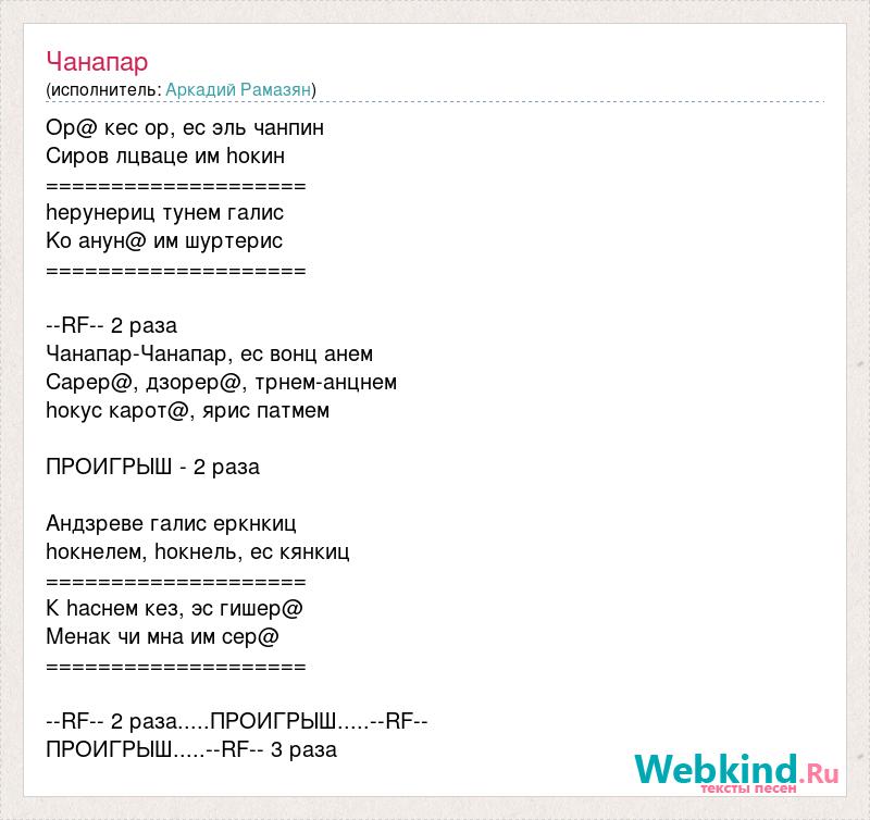 Ор@ кес ор, ес эль чанпин Сиров лцваце им hoкин ==================== hерунериц тунем галис Kо анун@ им шуртерис ==================== --RF-- 2 раза Чанапар-Чанапар, ес вонц анем Сарер@, дзорер@, трнем-анцнем hокус карот@, ярис патмем ПРОИГРЫШ - 2 раза Андзреве галис еркнкиц hокнелем, hокнель, ес кянкиц ==================== К hаснем кез, эс гишер@ Менак чи мна им сер@ ==================== --RF-- 2 раза.....ПРОИГРЫШ.....--RF-- ПРОИГРЫШ.....--RF-- 3 раза
