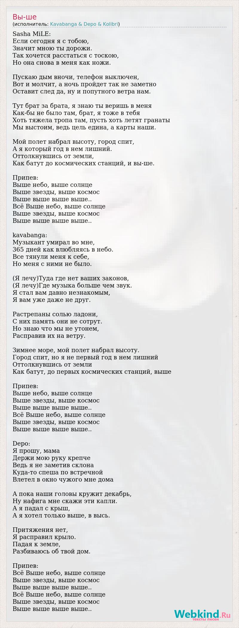 Sasha MiLE: Если сегодня я с тобою, Значит мною ты дорожи. Так хочется расстаться с тоскою, Но она снова в меня как ножи. Пускаю дым вночи, телефон выключен, Вот и молчит, а ночь пройдет так не заметно Оставит след да, ну и попутного ветра нам. Тут брат за брата, я знаю ты веришь в меня Как-бы не было там, брат, я тоже в тебя Хоть тяжела тропа там, пусть хоть летят гранаты Мы выстоим, ведь цель едина, а карты наши. Мой полет набрал высоту, город спит, А я который год в нем лишний. Оттолкнувшись от земли, Как батут до космических станций, и вы-ше. Припев: Выше небо, выше солнце Выше звезды, выше космос Выше выше выше выше.. Всё Выше небо, выше солнце Выше звезды, выше космос Выше выше выше выше.. kavabanga: Музыкант умирал во мне, 365 дней как влюбляясь в небо. Все тянули меня к себе, Но меня с ними не было. (Я лечу)Туда где нет ваших законов, (Я лечу)Где музыка больше чем звук. Я стал вам давно незнакомым, Я вам уже даже не друг. Растрепаны солью ладони, С них память они не сотрут. Но знаю что мы не утонем, Расправив их на ветру. Зимнее море, мой полет набрал высоту. Город спит, но я не первый год в нем лишний Оттолкнувшись от земли Как батут, до первых космических станций, выше Припев: Выше небо, выше солнце Выше звезды, выше космос Выше выше выше выше.. Всё Выше небо, выше солнце Выше звезды, выше космос Выше выше выше выше.. Depo: Я прошу, мама Держи мою руку крепче Ведь я не заметив склона Куда-то спеша по встречной Влетел в окно чужого мне дома А пока наши головы кружит декабрь, Ну нафига мне скажи эти капли. А я падал с крыш, А я хотел только выше, в высь. Притяжения нет, Я расправил крыло. Падая к земле, Разбиваюсь об твой дом. Припев: Всё Выше небо, выше солнце Выше звезды, выше космос Выше выше выше выше.. Всё Выше небо, выше солнце Выше звезды, выше космос Выше выше выше выше..