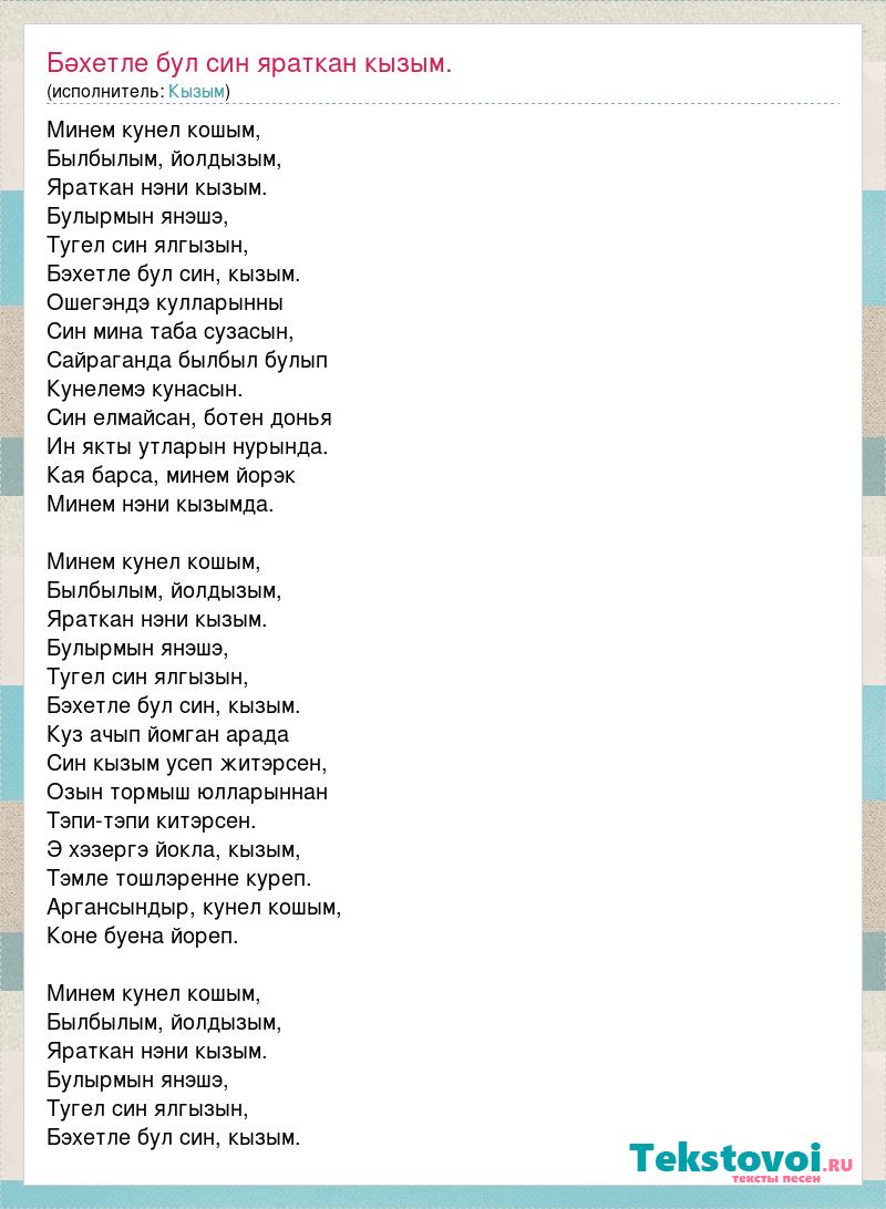 Минем кунел кошым, Былбылым, йолдызым, Яраткан нэни кызым. Булырмын янэшэ, Тугел син ялгызын, Бэхетле бул син, кызым. Ошегэндэ кулларынны Син мина таба сузасын, Сайраганда былбыл булып Кунелемэ кунасын. Син елмайсан, ботен донья Ин якты утларын нурында. Кая барса, минем йорэк Минем нэни кызымда. Минем кунел кошым, Былбылым, йолдызым, Яраткан нэни кызым. Булырмын янэшэ, Тугел син ялгызын, Бэхетле бул син, кызым. Куз ачып йомган арада Син кызым усеп житэрсен, Озын тормыш юлларыннан Тэпи-тэпи китэрсен. Э хэзергэ йокла, кызым, Тэмле тошлэренне куреп. Аргансындыр, кунел кошым, Коне буена йореп. Минем кунел кошым, Былбылым, йолдызым, Яраткан нэни кызым. Булырмын янэшэ, Тугел син ялгызын, Бэхетле бул син, кызым.
