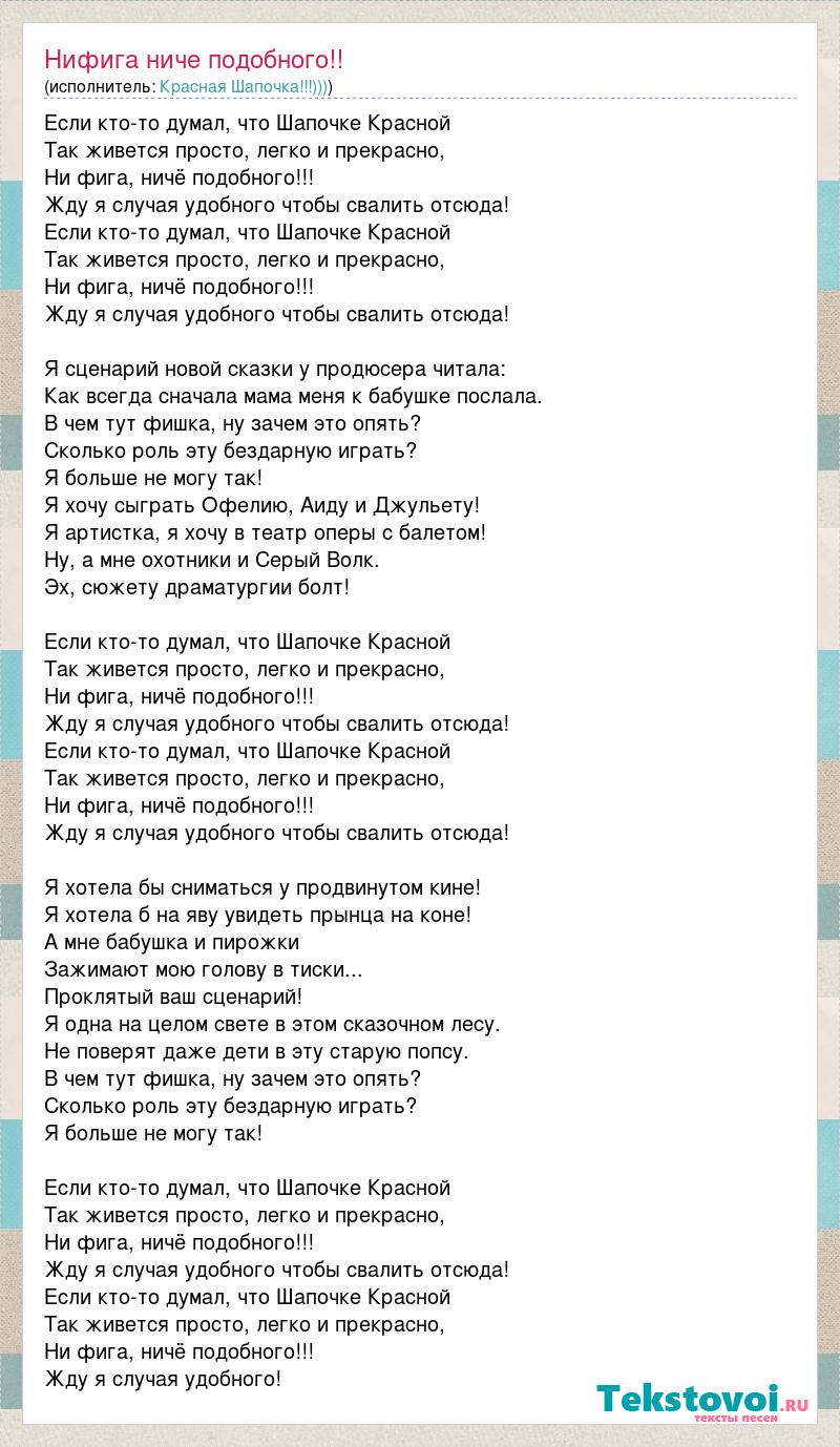 Если кто-то думал, что Шапочке Красной Так живется просто, легко и прекрасно, Ни фига, ничё подобного!!! Жду я случая удобного чтобы свалить отсюда! Если кто-то думал, что Шапочке Красной Так живется просто, легко и прекрасно, Ни фига, ничё подобного!!! Жду я случая удобного чтобы свалить отсюда! Я сценарий новой сказки у продюсера читала: Как всегда сначала мама меня к бабушке послала. В чем тут фишка, ну зачем это опять? Сколько роль эту бездарную играть? Я больше не могу так! Я хочу сыграть Офелию, Аиду и Джульету! Я артистка, я хочу в театр оперы с балетом! Ну, а мне охотники и Серый Волк. Эх, сюжету драматургии болт! Если кто-то думал, что Шапочке Красной Так живется просто, легко и прекрасно, Ни фига, ничё подобного!!! Жду я случая удобного чтобы свалить отсюда! Если кто-то думал, что Шапочке Красной Так живется просто, легко и прекрасно, Ни фига, ничё подобного!!! Жду я случая удобного чтобы свалить отсюда! Я хотела бы сниматься у продвинутом кине! Я хотела б на яву увидеть прынца на коне! А мне бабушка и пирожки Зажимают мою голову в тиски... Проклятый ваш сценарий! Я одна на целом свете в этом сказочном лесу. Не поверят даже дети в эту старую попсу. В чем тут фишка, ну зачем это опять? Сколько роль эту бездарную играть? Я больше не могу так! Если кто-то думал, что Шапочке Красной Так живется просто, легко и прекрасно, Ни фига, ничё подобного!!! Жду я случая удобного чтобы свалить отсюда! Если кто-то думал, что Шапочке Красной Так живется просто, легко и прекрасно, Ни фига, ничё подобного!!! Жду я случая удобного!