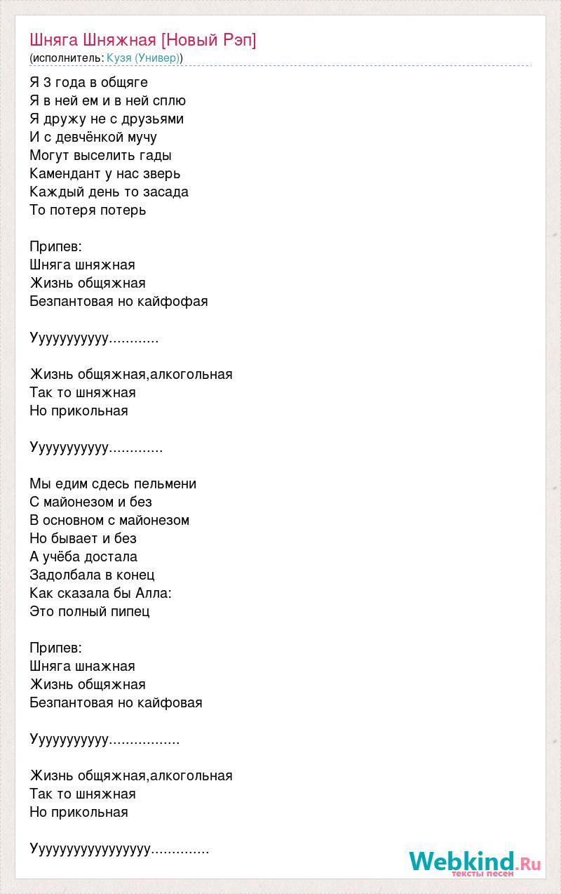 Я 3 года в общяге Я в ней ем и в ней сплю Я дружу не с друзьями И с девчёнкой мучу Могут выселить гады Камендант у нас зверь Каждый день то засада То потеря потерь Припев: Шняга шняжная Жизнь общяжная Безпантовая но кайфофая Ууууууууууу............ Жизнь общяжная,алкогольная Так то шняжная Но прикольная Ууууууууууу............. Мы едим сдесь пельмени С майонезом и без В основном с майонезом Но бывает и без А учёба достала Задолбала в конец Как сказала бы Алла: Это полный пипец Припев: Шняга шнажная Жизнь общяжная Безпантовая но кайфовая Ууууууууууу................. Жизнь общяжная,алкогольная Так то шняжная Но прикольная Ууууууууууууууууу..............