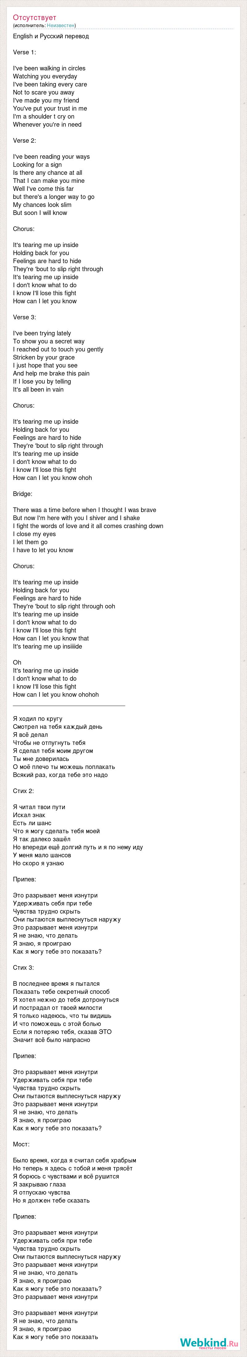 English и Русский перевод Verse 1: I've been walking in circles Watching you everyday I've been taking every care Not to scare you away I've made you my friend You've put your trust in me I'm a shoulder t cry on Whenever you're in need Verse 2: I've been reading your ways Looking for a sign Is there any chance at all That I can make you mine Well I've come this far but there's a longer way to go My chances look slim But soon I will know Chorus: It's tearing me up inside Holding back for you Feelings are hard to hide They're 'bout to slip right through It's tearing me up inside I don't know what to do I know I'll lose this fight How can I let you know Verse 3: I've been trying lately To show you a secret way I reached out to touch you gently Stricken by your grace I just hope that you see And help me brake this pain If I lose you by telling It's all been in vain Chorus: It's tearing me up inside Holding back for you Feelings are hard to hide They're 'bout to slip right through It's tearing me up inside I don't know what to do I know I'll lose this fight How can I let you know ohoh Bridge: There was a time before when I thought I was brave But now I'm here with you I shiver and I shake I fight the words of love and it all comes crashing down I close my eyes I let them go I have to let you know Chorus: It's tearing me up inside Holding back for you Feelings are hard to hide They're 'bout to slip right through ooh It's tearing me up inside I don't know what to do I know I'll lose this fight How can I let you know that It's tearing me up insiiiide Oh It's tearing me up inside I don't know what to do I know I'll lose this fight How can I let you know ohohoh _________________________________ Я ходил по кругу Смотрел на тебя каждый день Я всё делал Чтобы не отпугнуть тебя Я сделал тебя моим другом Ты мне доверилась О моё плечо ты можешь поплакать Всякий раз, когда тебе это надо Стих 2: Я читал твои пути Искал знак Есть ли шанс Что я могу сделать тебя моей Я так далеко зашёл Но впереди ещё долгий путь и я по нему иду У меня мало шансов Но скоро я узнаю Припев: Это разрывает меня изнутри Удерживать себя при тебе Чувства трудно скрыть Они пытаются выплеснуться наружу Это разрывает меня изнутри Я не знаю, что делать Я знаю, я проиграю Как я могу тебе это показать? Стих 3: В последнее время я пытался Показать тебе секретный способ Я хотел нежно до тебя дотронуться И пострадал от твоей милости Я только надеюсь, что ты видишь И что поможешь с этой болью Если я потеряю тебя, сказав ЭТО Значит всё было напрасно Припев: Это разрывает меня изнутри Удерживать себя при тебе Чувства трудно скрыть Они пытаются выплеснуться наружу Это разрывает меня изнутри Я не знаю, что делать Я знаю, я проиграю Как я могу тебе это показать? Мост: Было время, когда я считал себя храбрым Но теперь я здесь с тобой и меня трясёт Я борюсь с чувствами и всё рушится Я закрываю глаза Я отпускаю чувства Но я должен тебе сказать Припев: Это разрывает меня изнутри Удерживать себя при тебе Чувства трудно скрыть Они пытаются выплеснуться наружу Это разрывает меня изнутри Я не знаю, что делать Я знаю, я проиграю Как я могу тебе это показать? Это разрывает меня изнутри Это разрывает меня изнутри Я не знаю, что делать Я знаю, я проиграю Как я могу тебе это показать
