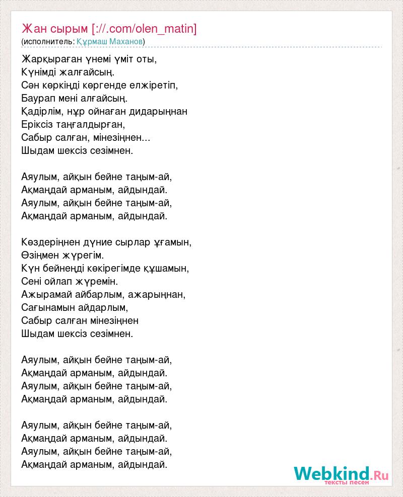 Жарқыраған үнемі үміт оты, Күнімді жалғайсың. Сән көркіңді көргенде елжіретіп, Баурап мені алғайсың. Қадірлім, нұр ойнаған дидарыңнан Еріксіз таңғалдырған, Сабыр салған, мінезіңнен... Шыдам шексіз сезімнен. Аяулым, айқын бейне таңым-ай, Ақмаңдай арманым, айдындай. Аяулым, айқын бейне таңым-ай, Ақмаңдай арманым, айдындай. Көздеріңнен дүние сырлар ұғамын, Өзіңмен жүрегім. Күн бейнеңді көкірегімде құшамын, Сені ойлап жүремін. Ажырамай айбарлым, ажарыңнан, Сағынамын айдарлым, Сабыр салған мінезіңнен Шыдам шексіз сезімнен. Аяулым, айқын бейне таңым-ай, Ақмаңдай арманым, айдындай. Аяулым, айқын бейне таңым-ай, Ақмаңдай арманым, айдындай. Аяулым, айқын бейне таңым-ай, Ақмаңдай арманым, айдындай. Аяулым, айқын бейне таңым-ай, Ақмаңдай арманым, айдындай.