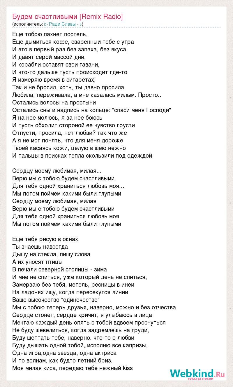 Еще тобою пахнет постель, Еще дымиться кофе, сваренный тебе с утра И это в первый раз без запаха, без вкуса, И давят серой массой дни, И корабли оставят свои гавани, И что-то дальше пусть происходит где-то Я измеряю время в сигаретах, Так и не бросил, хоть, ты давно просила, Любила, переживала, а мне казалась милым. Просто.. Остались волосы на простыни Остались сны и надпись на кольце: "спаси меня Господи" Я на нее молюсь, я за нее боюсь И пусть обходит стороной ее чувство грусти Отпусти, просила, нет любви? так что же А я не мог понять, что для меня дороже Твоей касаясь кожи, целую в шею нежно И пальцы в поисках тепла скользили под одеждой Сердцу моему любимая, милая... Верю мы с тобою будем счастливыми. Для тебя одной храниться любовь моя... Мы потом поймем какими были глупыми Сердцу моему любимая, милая Верю мы с тобою будем счастливыми Для тебя одной храниться любовь моя Мы потом поймем какими были глупыми Еще тебя рисую в окнах Ты знаешь навсегда Дышу на стекла, пишу слова А их уносят птицы В печали северной столицы - зима И мне не спиться, уже который день не спиться, Замерзаю без тебя, метель, ресницы в инеи На ладонях ищу, когда пересекутся линии Ваше высочество "одиночество" Мы с тобою теперь друзья, наверно, можно и без отчества Сердце стонет, сердце кричит, я улыбаюсь в лица Мечтаю каждый день опять с тобой вдвоем проснуться Не буду шевелиться, когда задремлешь на груди, Буду шептать тебе, наверно. что-то о любви Буду дышать одной тобой, исполню все капризы, Одна игра,одна звезда, одна актриса И по волнам, как будто летний бриз, Моя милая киса, передаю тебе нежный kiss