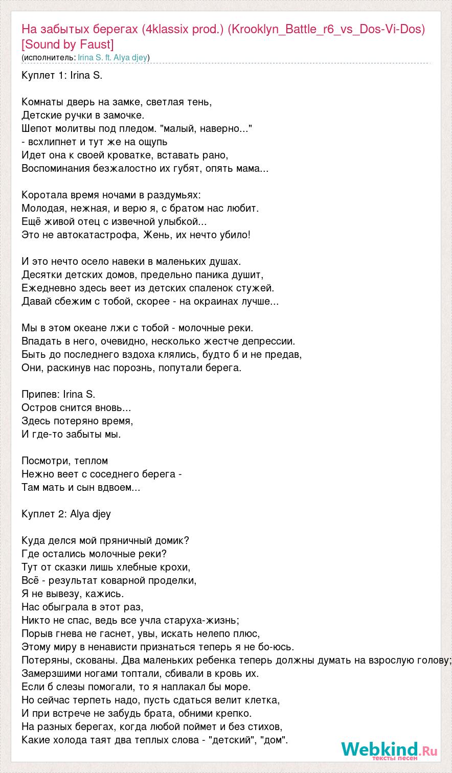 Куплет 1: Irina S. Комнаты дверь на замке, светлая тень, Детские ручки в замочке. Шепот молитвы под пледом. "малый, наверно..." - всхлипнет и тут же на ощупь Идет она к своей кроватке, вставать рано, Воспоминания безжалостно их губят, опять мама... Коротала время ночами в раздумьях: Молодая, нежная, и верю я, с братом нас любит. Ещё живой отец с извечной улыбкой... Это не автокатастрофа, Жень, их нечто убило! И это нечто осело навеки в маленьких душах. Десятки детских домов, предельно паника душит, Ежедневно здесь веет из детских спаленок стужей. Давай сбежим с тобой, скорее - на окраинах лучше... Мы в этом океане лжи с тобой - молочные реки. Впадать в него, очевидно, несколько жестче депрессии. Быть до последнего вздоха клялись, будто б и не предав, Они, раскинув нас порознь, попутали берега. Припев: Irina S. Остров снится вновь... Здесь потеряно время, И где-то забыты мы. Посмотри, теплом Нежно веет с соседнего берега - Там мать и сын вдвоем... Куплет 2: Alya djey Куда делся мой пряничный домик? Где остались молочные реки? Тут от сказки лишь хлебные крохи, Всё - результат коварной проделки, Я не вывезу, кажись. Нас обыграла в этот раз, Никто не спас, ведь все учла старуха-жизнь; Порыв гнева не гаснет, увы, искать нелепо плюс, Этому миру в ненависти признаться теперь я не бо-юсь. Потеряны, скованы. Два маленьких ребенка теперь должны думать на взрослую голову; Замерзшими ногами топтали, сбивали в кровь их. Если б слезы помогали, то я наплакал бы море. Но сейчас терпеть надо, пусть сдаться велит клетка, И при встрече не забудь брата, обними крепко. На разных берегах, когда любой поймет и без стихов, Какие холода таят два теплых слова - "детский", "дом".