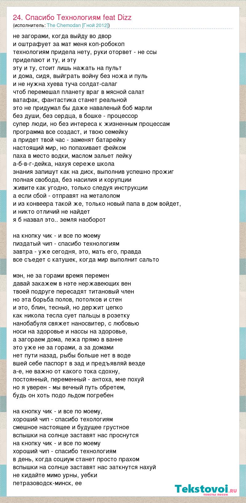 не загорами, когда выйду во двор и оштрафует за мат меня коп-робокоп технологиям придела нету, руки оторвет - не ссы приделают и ту, и эту эту и ту, стоит лишь нажать на пульт и дома, сидя, выйграть войну без ножа и пуль и не нужна хуева туча солдат-салаг чтоб перемешал планету враг в мясной салат ватафак, фантастика станет реальной это не придумал бы даже наваленый боб марли без души, без сердца, в бошке - процессор супер люди, но без интереса к жизненным процессам программа все создаст, и твою семейку а придет твой час - заменят батарейку настоящий мир, но попахивает фейком паха в место водки, маслом зальет лейку а-б-в-г-дейка, нахуя сереже школа знания запишут как на диск, выполнив успешно прожиг полная свобода, без насилия и корупции живите как угодно, только следуя инструкции а если сбой - отправят на металолом и из конвеера такой же, только новый папа в дом войдет, и никто отличий не найдет я б назвал это.. земля наоборот на кнопку чик - и все по моему пиздатый чип - спасибо технологиям завтра - уже сегодня, это, мать его, правда все съедет с катушек, когда мир выполнит сальто мэн, не за горами время перемен давай закажем в нэте нержавеющих вен твоей подруге пересадят титановый член но эта борьба полов, потолков и стен и это, блин, тесный, но держит цепко как никола тесла сует пальцы в розетку нанобабуля свяжет наносвитер, с любовью носи на здоровье и нассы на здоровье, а загораем дома, лежа прямо в ванне это уже не за горами, а за домами нет пути назад, рыбы больше нет в воде вшей себе паспорт в зад и предъявляй везде а-е, не важно от какого тока сдохну, постоянный, переменный - антоха, мне похуй но я уверен - мы вечный путь обретем, будь он хоть подо льдом погребен на кнопку чик - и все по моему, хороший чип - спасибо техологиям смешное настоящее и будущее грустное вспышки на солнце заставят нас проснутся на кнопку чик - и все по моему хороший чип - спасибо технологиям в день, когда социум станет просто прахом вспышки на солнце заставят нас заткнутся нахуй не кидайте мимо урны, уебки петразоводск-минск, ее
