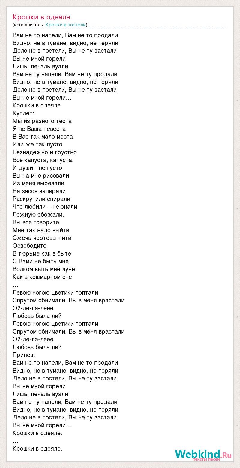 Вам не то напели, Вам не то продали Видно, не в тумане, видно, не теряли Дело не в постели, Вы не ту застали Вы не мной горели Лишь, печаль вуали Вам не ту напели, Вам не ту продали Видно, не в тумане, видно, не теряли Дело не в постели, Вы не ту застали Вы не мной горели… Крошки в одеяле. Куплет: Мы из разного теста Я не Ваша невеста В Вас так мало места Или же так пусто Безнадежно и грустно Все капуста, капуста. И души - не густо Вы на мне рисовали Из меня вырезали На засов запирали Раскрутили спирали Что любили – не знали Ложную обожали. Вы все говорите Мне так надо выйти Сжечь чертовы нити Освободите В тюрьме как в быте С Вами не быть мне Волком выть мне луне Как в кошмарном сне … Левою ногою цветики топтали Спрутом обнимали, Вы в меня врастали Ой-ле-ла-леее Любовь была ли? Левою ногою цветики топтали Спрутом обнимали, Вы в меня врастали Ой-ле-ла-леее Любовь была ли? Припев: Вам не то напели, Вам не то продали Видно, не в тумане, видно, не теряли Дело не в постели, Вы не ту застали Вы не мной горели Лишь, печаль вуали Вам не ту напели, Вам не ту продали Видно, не в тумане, видно, не теряли Дело не в постели, Вы не ту застали Вы не мной горели… Крошки в одеяле. … Крошки в одеяле.