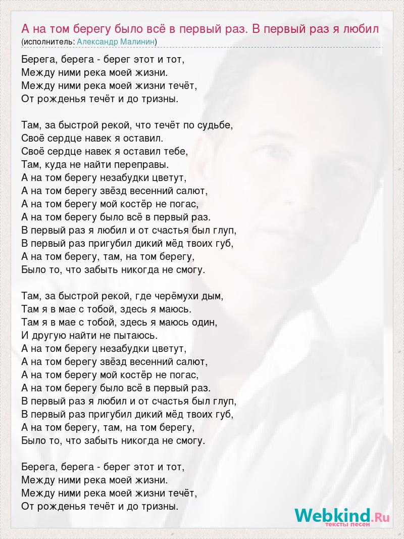 Берега, берега - берег этот и тот, Между ними река моей жизни. Между ними река моей жизни течёт, От рожденья течёт и до тризны. Там, за быстрой рекой, что течёт по судьбе, Своё сердце навек я оставил. Своё сердце навек я оставил тебе, Там, куда не найти переправы. А на том берегу незабудки цветут, А на том берегу звёзд весенний салют, А на том берегу мой костёр не погас, А на том берегу было всё в первый раз. В первый раз я любил и от счастья был глуп, В первый раз пригубил дикий мёд твоих губ, А на том берегу, там, на том берегу, Было то, что забыть никогда не смогу. Там, за быстрой рекой, где черёмухи дым, Там я в мае с тобой, здесь я маюсь. Там я в мае с тобой, здесь я маюсь один, И другую найти не пытаюсь. А на том берегу незабудки цветут, А на том берегу звёзд весенний салют, А на том берегу мой костёр не погас, А на том берегу было всё в первый раз. В первый раз я любил и от счастья был глуп, В первый раз пригубил дикий мёд твоих губ, А на том берегу, там, на том берегу, Было то, что забыть никогда не смогу. Берега, берега - берег этот и тот, Между ними река моей жизни. Между ними река моей жизни течёт, От рожденья течёт и до тризны.