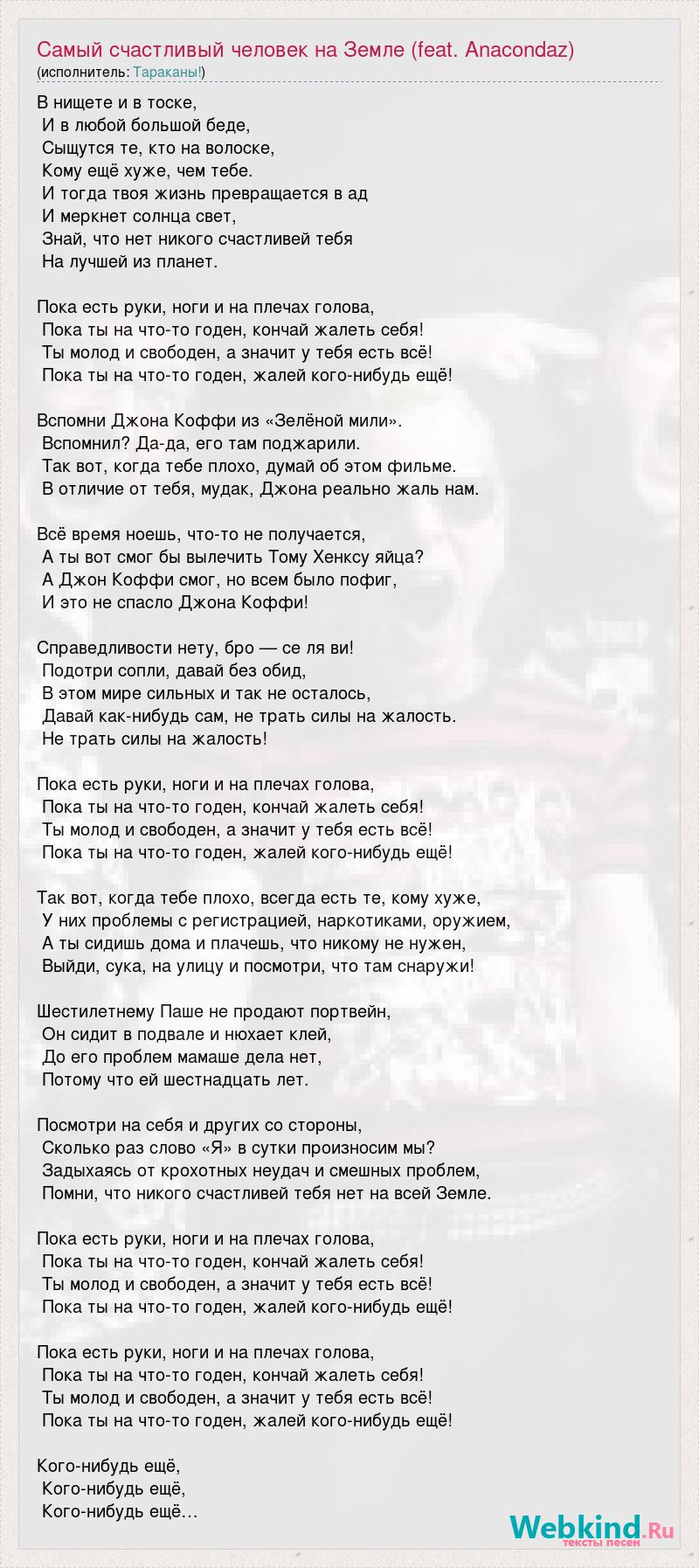 В нищете и в тоске, И в любой большой беде, Сыщутся те, кто на волоске, Кому ещё хуже, чем тебе. И тогда твоя жизнь превращается в ад И меркнет солнца свет, Знай, что нет никого счастливей тебя На лучшей из планет. Пока есть руки, ноги и на плечах голова, Пока ты на что-то годен, кончай жалеть себя! Ты молод и свободен, а значит у тебя есть всё! Пока ты на что-то годен, жалей кого-нибудь ещё! Вспомни Джона Коффи из «Зелёной мили». Вспомнил? Да-да, его там поджарили. Так вот, когда тебе плохо, думай об этом фильме. В отличие от тебя, мудак, Джона реально жаль нам. Всё время ноешь, что-то не получается, А ты вот смог бы вылечить Тому Хенксу яйца? А Джон Коффи смог, но всем было пофиг, И это не спасло Джона Коффи! Справедливости нету, бро — се ля ви! Подотри сопли, давай без обид, В этом мире сильных и так не осталось, Давай как-нибудь сам, не трать силы на жалость. Не трать силы на жалость! Пока есть руки, ноги и на плечах голова, Пока ты на что-то годен, кончай жалеть себя! Ты молод и свободен, а значит у тебя есть всё! Пока ты на что-то годен, жалей кого-нибудь ещё! Так вот, когда тебе плохо, всегда есть те, кому хуже, У них проблемы с регистрацией, наркотиками, оружием, А ты сидишь дома и плачешь, что никому не нужен, Выйди, сука, на улицу и посмотри, что там снаружи! Шестилетнему Паше не продают портвейн, Он сидит в подвале и нюхает клей, До его проблем мамаше дела нет, Потому что ей шестнадцать лет. Посмотри на себя и других со стороны, Сколько раз слово «Я» в сутки произносим мы? Задыхаясь от крохотных неудач и смешных проблем, Помни, что никого счастливей тебя нет на всей Земле. Пока есть руки, ноги и на плечах голова, Пока ты на что-то годен, кончай жалеть себя! Ты молод и свободен, а значит у тебя есть всё! Пока ты на что-то годен, жалей кого-нибудь ещё! Пока есть руки, ноги и на плечах голова, Пока ты на что-то годен, кончай жалеть себя! Ты молод и свободен, а значит у тебя есть всё! Пока ты на что-то годен, жалей кого-нибудь ещё! Кого-нибудь ещё, Кого-нибудь ещё, Кого-нибудь ещё…