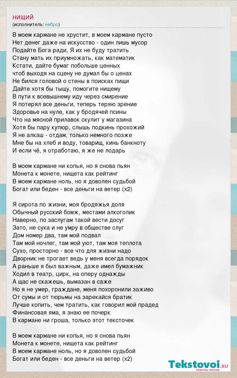 В моем кармане не хрустит, в моем кармане пусто Нет денег даже на искусство - один лишь мусор Подайте Бога ради, Я их не буду тратить Стану мать их приумножать, как математик Кстати, дайте бумаг побольше ценных чтоб выходя на сцену не думал бы о ценах Не бился головой о стены в поисках пищи Дайте хотя бы тыщу, помогите нищему В пути к всевышнему иду через смирение Я потерял все деньги, теперь теряю зрение Здоровье на нуле, как у бродячей псины Что на мясной прилавок скулит у магазина Хотя бы пару купюр, слышь подкинь прохожий Я не алкаш - отдам, только немного позже Мне бы на хлеб и воду, товарищ, кинь банкноту И если чё, я отработаю, я же не лодарь В моем кармане ни копья, но я снова пьян Монета к монете, нищета как рейтинг В моем кармане ноль, но я доволен судьбой Богат или беден - все деньги на ветер (х2) Я сирота по жизни, моя бродяжья доля Обычный русский бомж, местами алкоголик Наверно, по заслугам такой вести досуг Зато, не сука и не умру в обществе слуг Дом номер два, там мой подвал Там мой ночлег, там мой уют, там моя теплота Сухо, просторно - все что для жизни надо Дворник не трогает ведь у меня всегда порядок А раньше я был важным, даже имел бумажник Ходил в театр, цирк, на оперу однажды А щас не скажешь, вымазан в саже Но я не умер, граждане, меня похоронили заживо От сумы и от тюрьмы на зарекайся братик Лучше копить, чем тратить, как говорил мой прадед Финансовая яма, я знаю ее почерк В кармане ни гроша, только этот тексточек В моем кармане ни копья, но я снова пьян Монета к монете, нищета как рейтинг В моем кармане ноль, но я доволен судьбой Богат или беден - все деньги на ветер (х2)