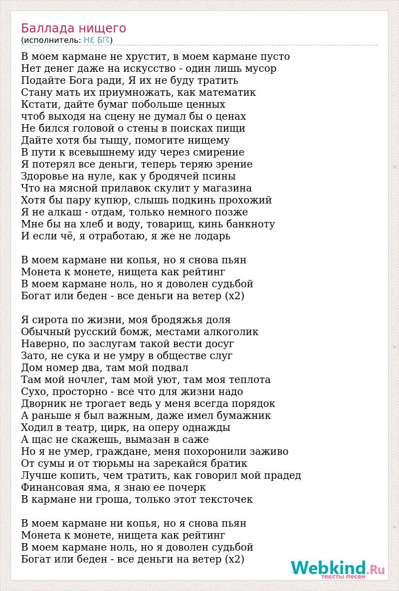 В моем кармане не хрустит, в моем кармане пусто Нет денег даже на искусство - один лишь мусор Подайте Бога ради, Я их не буду тратить Стану мать их приумножать, как математик Кстати, дайте бумаг побольше ценных чтоб выходя на сцену не думал бы о ценах Не бился головой о стены в поисках пищи Дайте хотя бы тыщу, помогите нищему В пути к всевышнему иду через смирение Я потерял все деньги, теперь теряю зрение Здоровье на нуле, как у бродячей псины Что на мясной прилавок скулит у магазина Хотя бы пару купюр, слышь подкинь прохожий Я не алкаш - отдам, только немного позже Мне бы на хлеб и воду, товарищ, кинь банкноту И если чё, я отработаю, я же не лодарь В моем кармане ни копья, но я снова пьян Монета к монете, нищета как рейтинг В моем кармане ноль, но я доволен судьбой Богат или беден - все деньги на ветер (х2) Я сирота по жизни, моя бродяжья доля Обычный русский бомж, местами алкоголик Наверно, по заслугам такой вести досуг Зато, не сука и не умру в обществе слуг Дом номер два, там мой подвал Там мой ночлег, там мой уют, там моя теплота Сухо, просторно - все что для жизни надо Дворник не трогает ведь у меня всегда порядок А раньше я был важным, даже имел бумажник Ходил в театр, цирк, на оперу однажды А щас не скажешь, вымазан в саже Но я не умер, граждане, меня похоронили заживо От сумы и от тюрьмы на зарекайся братик Лучше копить, чем тратить, как говорил мой прадед Финансовая яма, я знаю ее почерк В кармане ни гроша, только этот тексточек В моем кармане ни копья, но я снова пьян Монета к монете, нищета как рейтинг В моем кармане ноль, но я доволен судьбой Богат или беден - все деньги на ветер (х2)