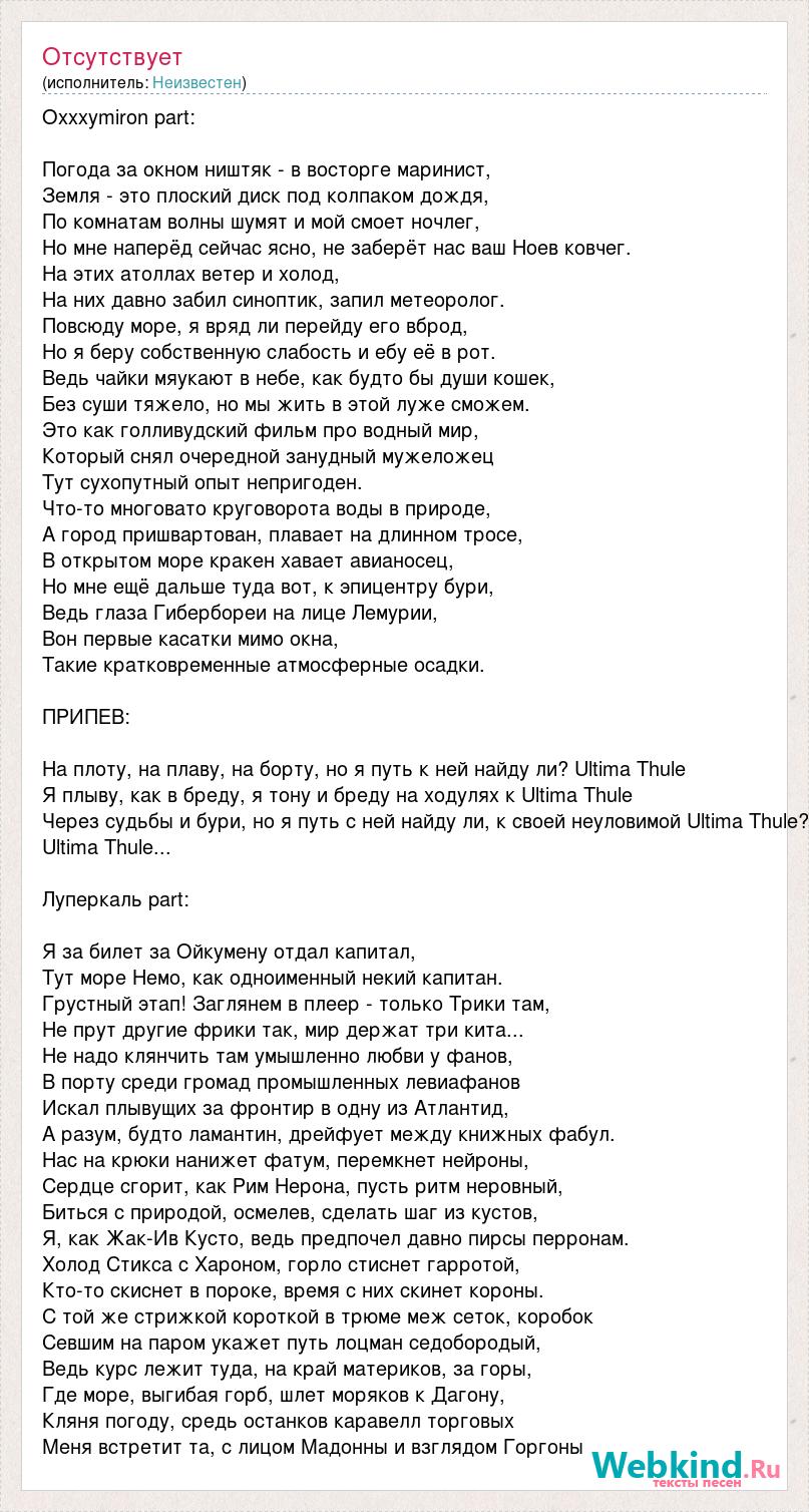 Oxxxymiron part: Погода за окном ништяк - в восторге маринист, Земля - это плоский диск под колпаком дождя, По комнатам волны шумят и мой смоет ночлег, Но мне наперёд сейчас ясно, не заберёт нас ваш Ноев ковчег. На этих атоллах ветер и холод, На них давно забил синоптик, запил метеоролог. Повсюду море, я вряд ли перейду его вброд, Но я беру собственную слабость и ебу её в рот. Ведь чайки мяукают в небе, как будто бы души кошек, Без суши тяжело, но мы жить в этой луже сможем. Это как голливудский фильм про водный мир, Который снял очередной занудный мужеложец Тут сухопутный опыт непригоден. Что-то многовато круговорота воды в природе, А город пришвартован, плавает на длинном тросе, В открытом море кракен хавает авианосец, Но мне ещё дальше туда вот, к эпицентру бури, Ведь глаза Гибербореи на лице Лемурии, Вон первые касатки мимо окна, Такие кратковременные атмосферные осадки. ПРИПЕВ: На плоту, на плаву, на борту, но я путь к ней найду ли? Ultima Thule Я плыву, как в бреду, я тону и бреду на ходулях к Ultima Thule Через судьбы и бури, но я путь с ней найду ли, к своей неуловимой Ultima Thule? Ultima Thule... Луперкаль part: Я за билет за Ойкумену отдал капитал, Тут море Немо, как одноименный некий капитан. Грустный этап! Заглянем в плеер - только Трики там, Не прут другие фрики так, мир держат три кита... Не надо клянчить там умышленно любви у фанов, В порту среди громад промышленных левиафанов Искал плывущих за фронтир в одну из Атлантид, А разум, будто ламантин, дрейфует между книжных фабул. Нас на крюки нанижет фатум, перемкнет нейроны, Сердце сгорит, как Рим Нерона, пусть ритм неровный, Биться с природой, осмелев, сделать шаг из кустов, Я, как Жак-Ив Кусто, ведь предпочел давно пирсы перронам. Холод Стикса с Хароном, горло стиснет гарротой, Кто-то скиснет в пороке, время с них скинет короны. С той же стрижкой короткой в трюме меж сеток, коробок Севшим на паром укажет путь лоцман седобородый, Ведь курс лежит туда, на край материков, за горы, Где море, выгибая горб, шлет моряков к Дагону, Кляня погоду, средь останков каравелл торговых Меня встретит та, с лицом Мадонны и взглядом Горгоны