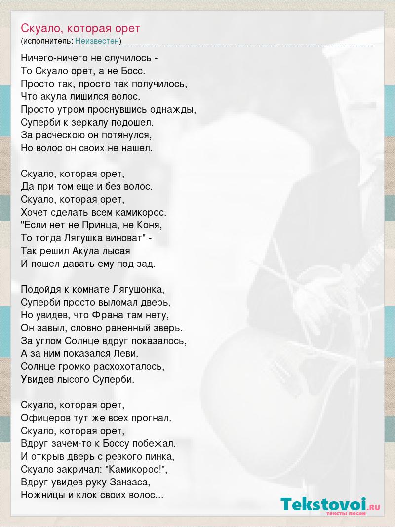 Ничего-ничего не случилось - То Скуало орет, а не Босс. Просто так, просто так получилось, Что акула лишился волос. Просто утром проснувшись однажды, Суперби к зеркалу подошел. За расческою он потянулся, Но волос он своих не нашел. Скуало, которая орет, Да при том еще и без волос. Скуало, которая орет, Хочет сделать всем камикорос. "Если нет не Принца, не Коня, То тогда Лягушка виноват" - Так решил Акула лысая И пошел давать ему под зад. Подойдя к комнате Лягушонка, Суперби просто выломал дверь, Но увидев, что Франа там нету, Он завыл, словно раненный зверь. За углом Солнце вдруг показалось, А за ним показался Леви. Солнце громко расхохоталось, Увидев лысого Суперби. Скуало, которая орет, Офицеров тут же всех прогнал. Скуало, которая орет, Вдруг зачем-то к Боссу побежал. И открыв дверь с резкого пинка, Скуало закричал: "Камикорос!", Вдруг увидев руку Занзаса, Ножницы и клок своих волос...
