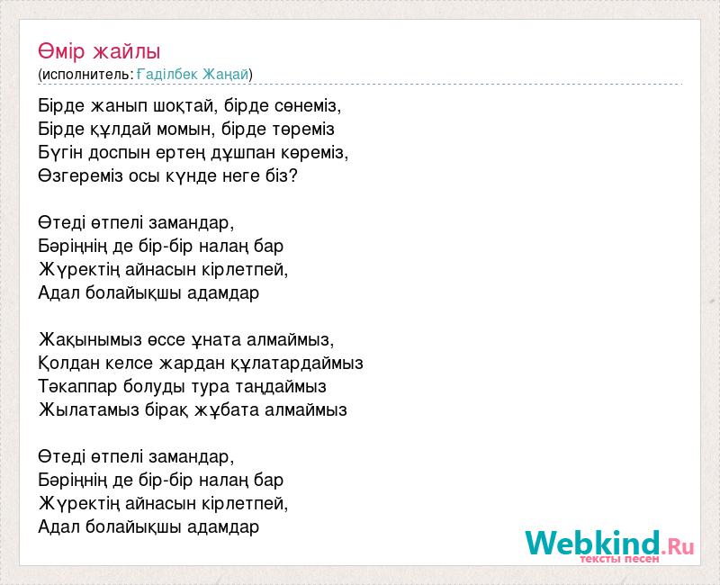 Бірде жанып шоқтай, бірде сөнеміз, Бірде құлдай момын, бірде төреміз Бүгін доспын ертең дұшпан көреміз, Өзгереміз осы күнде неге біз? Өтеді өтпелі замандар, Бәріңнің де бір-бір налаң бар Жүректің айнасын кірлетпей, Адал болайықшы адамдар Жақынымыз өссе ұната алмаймыз, Қолдан келсе жардан құлатардаймыз Тәкаппар болуды тура таңдаймыз Жылатамыз бірақ жұбата алмаймыз Өтеді өтпелі замандар, Бәріңнің де бір-бір налаң бар Жүректің айнасын кірлетпей, Адал болайықшы адамдар