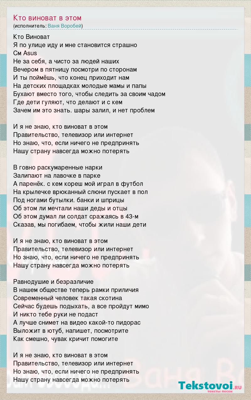 Кто Виноват Я по улице иду и мне становится страшно См Asus Не за себя, а чисто за людей наших Вечером в пятницу посмотри по сторонам И ты поймёшь, что конец приходит нам На детских площадках молодые мамы и папы Бухают вместо того, чтобы следить за своим чадом Где дети гуляют, что делают и с кем Зачем им это знать. шары залил, и нет проблем И я не знаю, кто виноват в этом Правительство, телевизор или интернет Но знаю, что, если ничего не предпринять Нашу страну навсегда можно потерять В говно раскумаренные нарки Залипают на лавочке в парке А паренёк. с кем кореш мой играл в футбол На крылечке врюканный слюни пускает в пол Под ногами бутылки. банки и шприцы Об этом ли мечтали наши деды и отцы Об этом думал ли солдат сражаясь в 43-м Сказав, мы погибаем, чтобы жили наши дети И я не знаю, кто виноват в этом Правительство, телевизор или интернет Но знаю, что, если ничего не предпринять Нашу страну навсегда можно потерять Равнодушие и безразличие В нашем обществе теперь рамки приличия Современный человек такая скотина Сейчас будешь подыхать, а все пройдут мимо И никто тебе руки не подаст А лучше снимет на видео какой-то пидорас Выложит в ютуб, напишет, посмотрите Как смешно, чувак кричит помогите И я не знаю, кто виноват в этом Правительство, телевизор или интернет Но знаю, что, если ничего не предпринять Нашу страну навсегда можно потерять