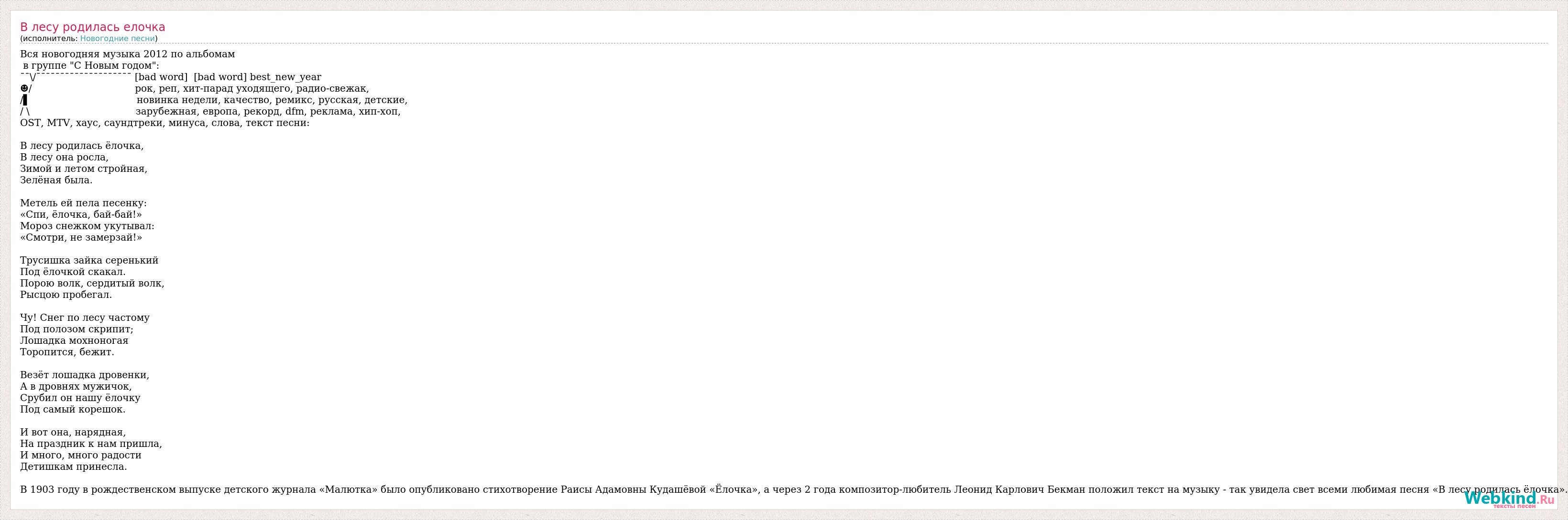 Вся новогодняя музыка 2012 по альбомам в группе "С Новым годом": ¯¯\/¯¯¯¯¯¯¯¯¯¯¯¯¯¯¯¯¯¯¯¯ [bad word] [bad word] best_new_year ☻/ рок, реп, хит-парад уходящего, радио-свежак, /▌ новинка недели, качество, ремикс, русская, детские, / \ зарубежная, европа, рекорд, dfm, реклама, хип-хоп, OST, MTV, хаус, саундтреки, минуса, слова, текст песни: В лесу родилась ёлочка, В лесу она росла, Зимой и летом стройная, Зелёная была. Метель ей пела песенку: «Спи, ёлочка, бай-бай!» Мороз снежком укутывал: «Смотри, не замерзай!» Трусишка зайка серенький Под ёлочкой скакал. Порою волк, сердитый волк, Рысцою пробегал. Чу! Снег по лесу частому Под полозом скрипит; Лошадка мохноногая Торопится, бежит. Везёт лошадка дровенки, А в дровнях мужичок, Срубил он нашу ёлочку Под самый корешок. И вот она, нарядная, На праздник к нам пришла, И много, много радости Детишкам принесла. В 1903 году в рождественском выпуске детского журнала «Малютка» было опубликовано стихотворение Раисы Адамовны Кудашёвой «Ёлочка», а через 2 года композитор-любитель Леонид Карлович Бекман положил текст на музыку - так увидела свет всеми любимая песня «В лесу родилась ёлочка».