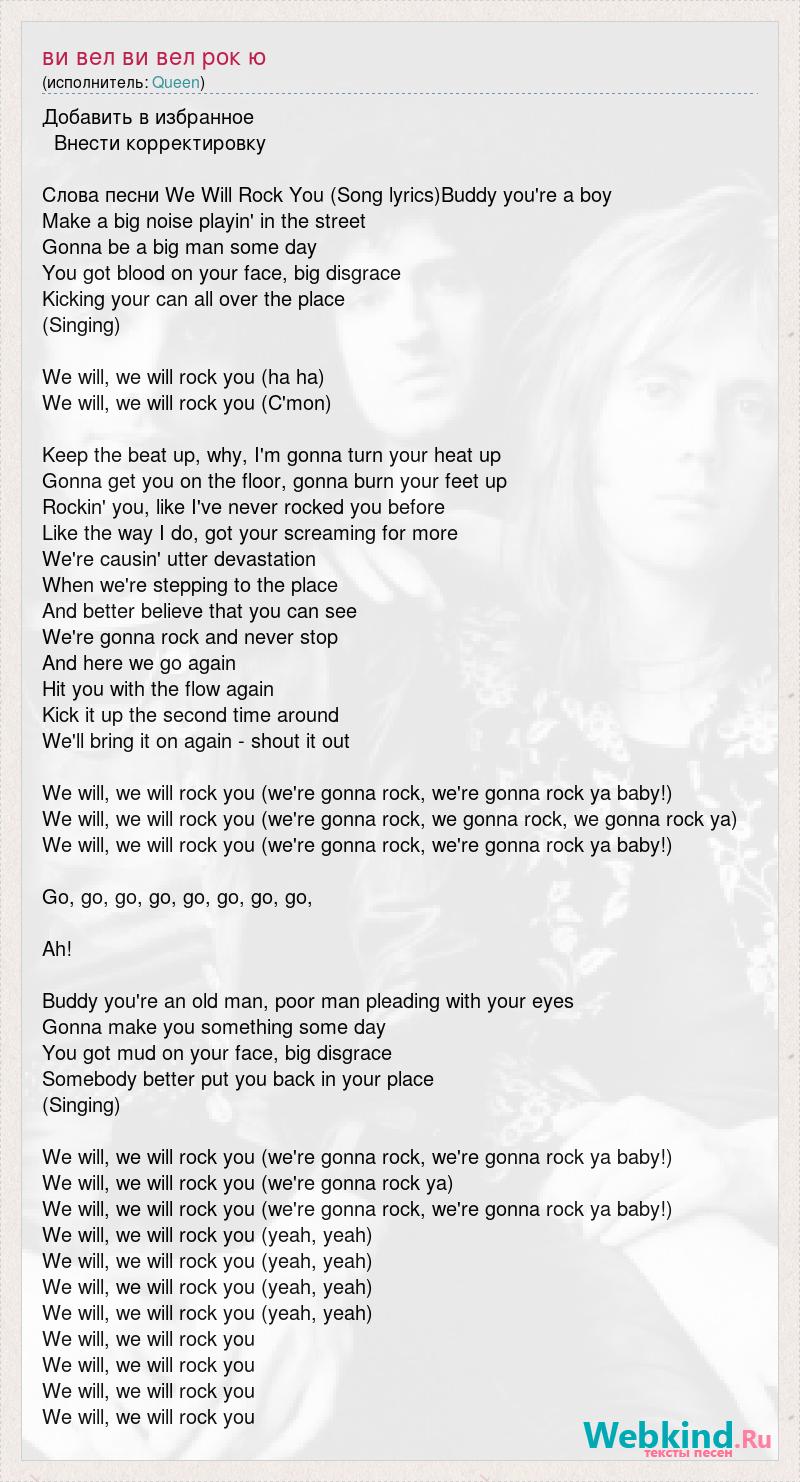 Добавить в избранное Внести корректировку Слова песни We Will Rock You (Song lyrics)Buddy you're a boy Make a big noise playin' in the street Gonna be a big man some day You got blood on your face, big disgrace Kicking your can all over the place (Singing) We will, we will rock you (ha ha) We will, we will rock you (C'mon) Keep the beat up, why, I'm gonna turn your heat up Gonna get you on the floor, gonna burn your feet up Rockin' you, like I've never rocked you before Like the way I do, got your screaming for more We're causin' utter devastation When we're stepping to the place And better believe that you can see We're gonna rock and never stop And here we go again Hit you with the flow again Kick it up the second time around We'll bring it on again - shout it out We will, we will rock you (we're gonna rock, we're gonna rock ya baby!) We will, we will rock you (we're gonna rock, we gonna rock, we gonna rock ya) We will, we will rock you (we're gonna rock, we're gonna rock ya baby!) Go, go, go, go, go, go, go, go, Ah! Buddy you're an old man, poor man pleading with your eyes Gonna make you something some day You got mud on your face, big disgrace Somebody better put you back in your place (Singing) We will, we will rock you (we're gonna rock, we're gonna rock ya baby!) We will, we will rock you (we're gonna rock ya) We will, we will rock you (we're gonna rock, we're gonna rock ya baby!) We will, we will rock you (yeah, yeah) We will, we will rock you (yeah, yeah) We will, we will rock you (yeah, yeah) We will, we will rock you (yeah, yeah) We will, we will rock you We will, we will rock you We will, we will rock you We will, we will rock you