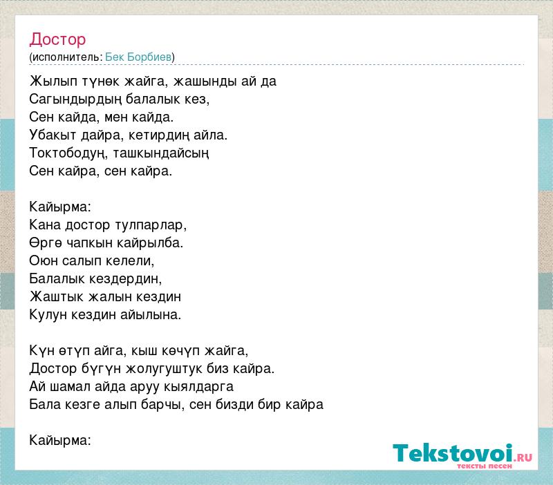 Жылып түнөк жайга, жашынды ай да Сагындырдың балалык кез, Сен кайда, мен кайда. Убакыт дайра, кетирдиң айла. Токтободуң, ташкындайсың Сен кайра, сен кайра. Кайырма: Кана достор тулпарлар, Өргө чапкын кайрылба. Оюн салып келели, Балалык кездердин, Жаштык жалын кездин Кулун кездин айылына. Күн өтүп айга, кыш көчүп жайга, Достор бүгүн жолугуштук биз кайра. Ай шамал айда аруу кыялдарга Бала кезге алып барчы, сен бизди бир кайра Кайырма: