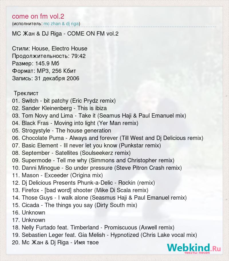 MC Жан & DJ Riga - COME ON FM vol.2 Стили: House, Electro House Продолжительность: 79:42 Размер: 145.9 Мб Формат: MP3, 256 Кбит Запись: 31 декабря 2006 Треклист 01. Switch - bit patchy (Eric Prydz remix) 02. Sander Kleinenberg - This is ibiza 03. Tom Novy and Lima - Take it (Seamus Haji & Paul Emanuel mix) 04. Black Fras - Moving into light (Yer Man remix) 05. Strogystyle - The house generation 06. Chocolate Puma - Always and forever (Till West and Dj Delicious remix) 07. Basic Element - Ill never let you know (Punkstar remix) 08. September - Satellites (Soulseekerz remix) 09. Supermode - Tell me why (Simmons and Christopher remix) 10. Danni Minogue - So under pressure (Steve Pitron Crash remix) 11. Mason - Exceeder (Origina mix) 12. Dj Delicious Presents Phunk-a-Delic - Rockin (remix) 13. Firefox - [bad word] shooter (Mike Di Scala remix) 14. Those Guys - I walk alone (Seasmus Haji & Paul Emanuel remix) 15. Cicada - The things you say (Dirty South mix) 16. Unknown 17. Unknown 18. Nelly Furtado feat. Timberland - Promiscuous (Axwell remix) 19. Sebastien Leger feat. Gia Melish - Hypnotized (Chris Lake vocal mix) 20. Мс Жан & Dj Riga - Имя твое