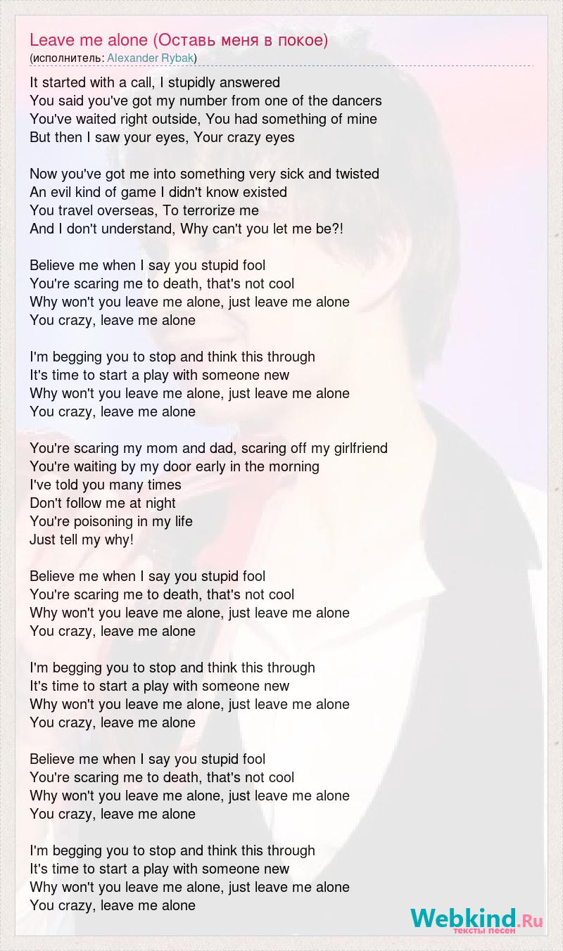 It started with a call, I stupidly answered You said you've got my number from one of the dancers You've waited right outside, You had something of mine But then I saw your eyes, Your crazy eyes Now you've got me into something very sick and twisted An evil kind of game I didn't know existed You travel overseas, To terrorize me And I don't understand, Why can't you let me be?! Believe me when I say you stupid fool You're scaring me to death, that's not cool Why won't you leave me alone, just leave me alone You crazy, leave me alone I'm begging you to stop and think this through It's time to start a play with someone new Why won't you leave me alone, just leave me alone You crazy, leave me alone You're scaring my mom and dad, scaring off my girlfriend You're waiting by my door early in the morning I've told you many times Don't follow me at night You're poisoning in my life Just tell my why! Believe me when I say you stupid fool You're scaring me to death, that's not cool Why won't you leave me alone, just leave me alone You crazy, leave me alone I'm begging you to stop and think this through It's time to start a play with someone new Why won't you leave me alone, just leave me alone You crazy, leave me alone Believe me when I say you stupid fool You're scaring me to death, that's not cool Why won't you leave me alone, just leave me alone You crazy, leave me alone I'm begging you to stop and think this through It's time to start a play with someone new Why won't you leave me alone, just leave me alone You crazy, leave me alone